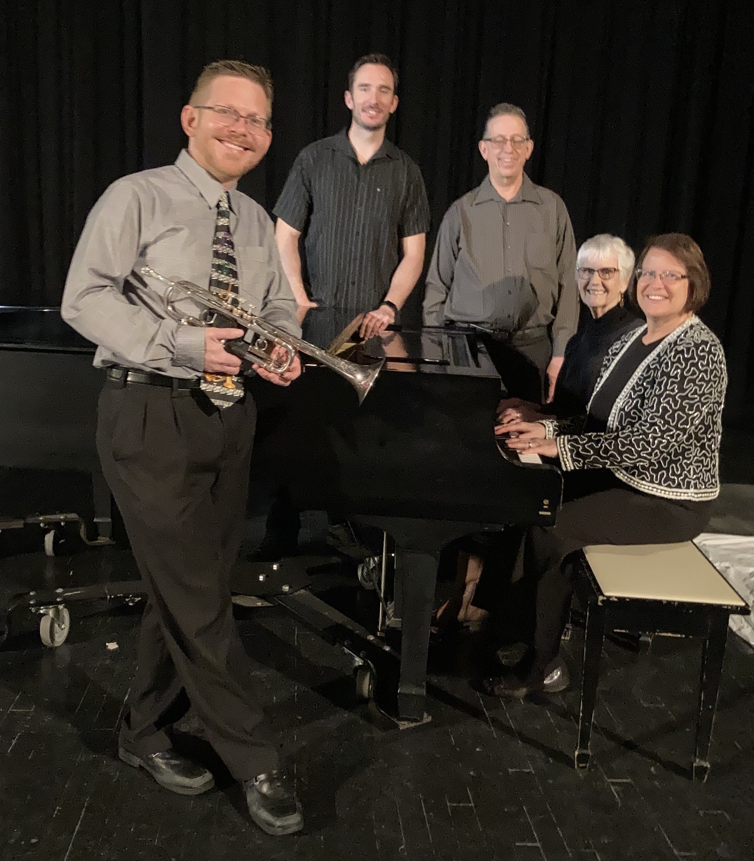 Description: James Lind and Friends in rehearsal. Left to right: Mary Belew, Dean Rees and Sally Kappel, piano (plus Matthew Beard, glorified page turner), and James Lind, trumpet. (Photo by Bette McFarren)