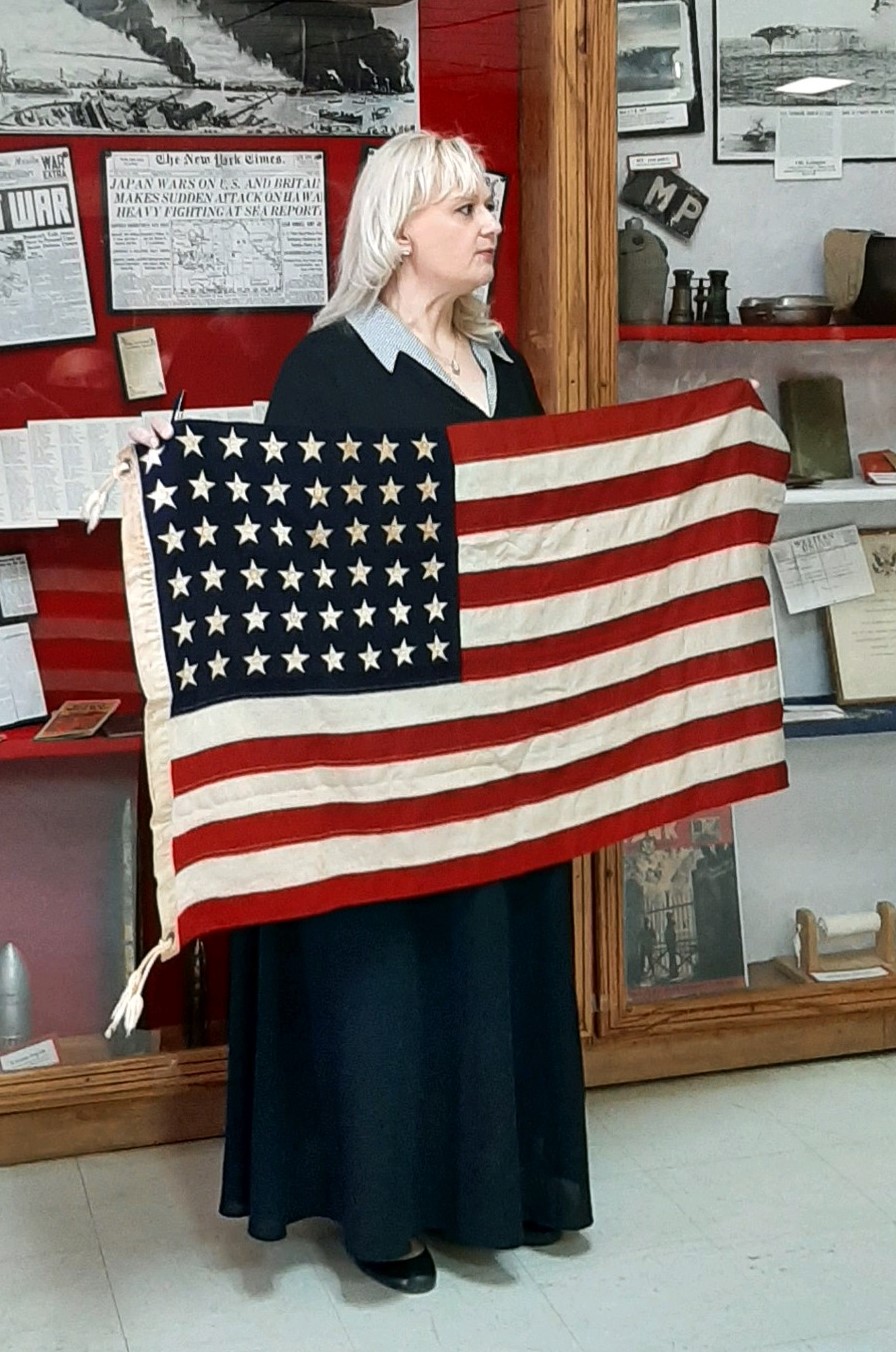 Amanda Leck, Bent County Development Coordinator, holding a 48-star flag that flew on the Navy Ship, the U. S. S. Forrestal, during the Vietnam War. They had a big fire on the ship in 1967 and her dad helped put out the fire. She was able to buy this flag that flew on the ship.