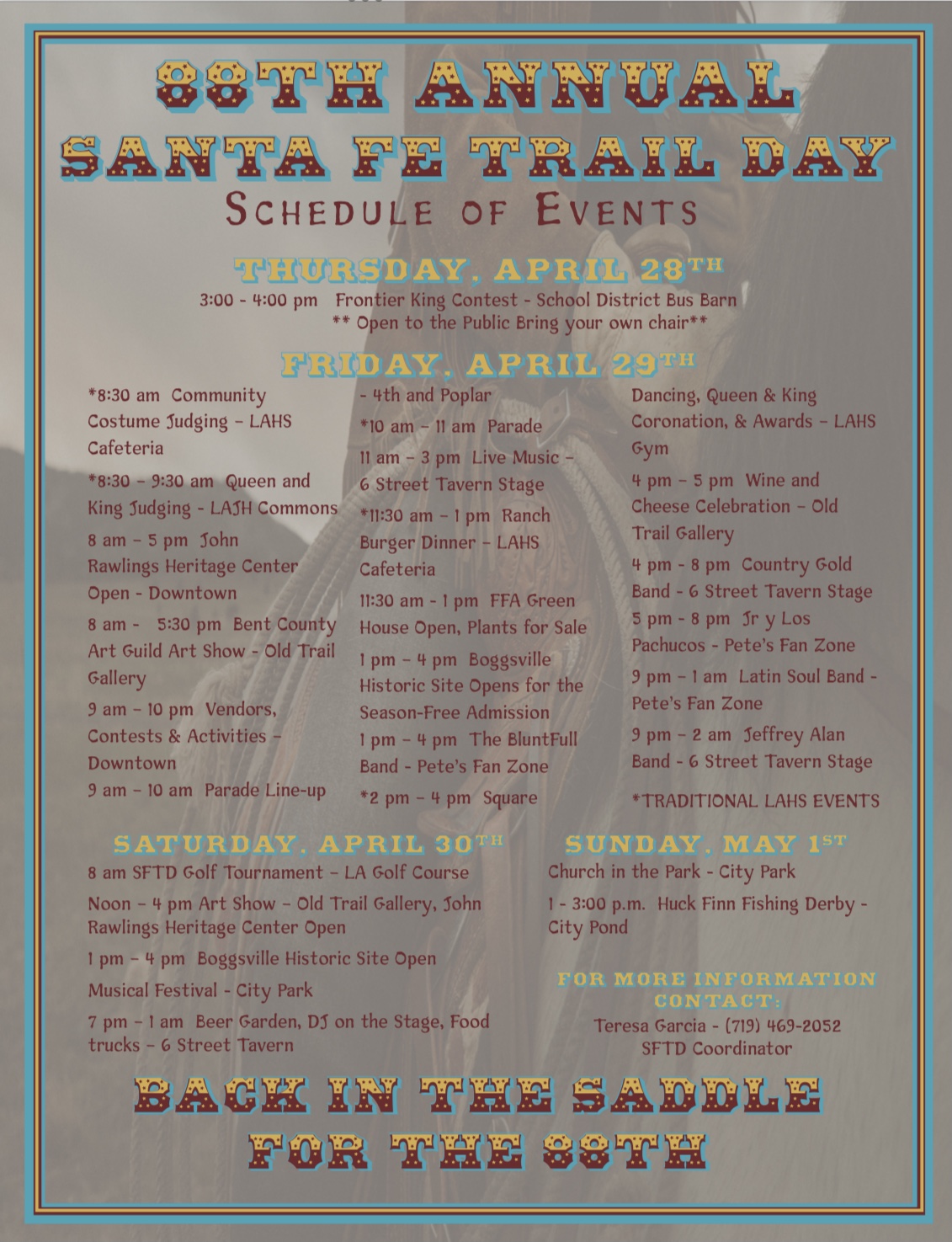 Description: 88th Annual Santa Fe Trail Day Schedule of Events... Thursday, April 28 - Sunday, May 1, 2022 in Las Animas, Colorado.