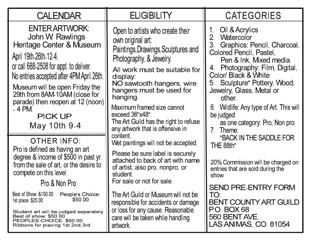 Local and area artists may enter your artwork at the Museum between April 19th and 26th from 1pm to 4pm or call Linda Bourne, Bent County Art Guild President, at 719-688-2508 for an appointment to deliver.