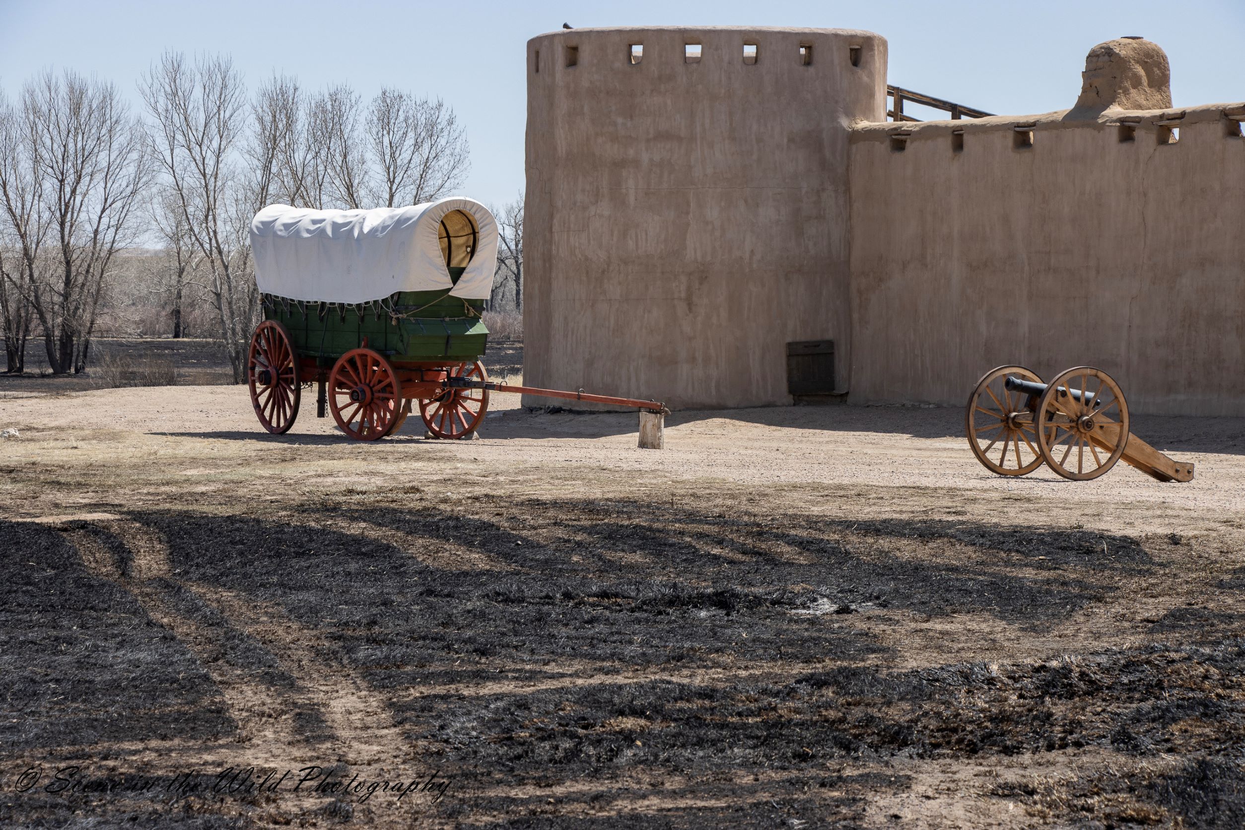 Description: The cannon and Conestoga wagon were saved from the wildfire as was the fort itself at Bents Old Fort National Historic Site in La Junta, Colorado. (Photo Credit: Sue Keefer)