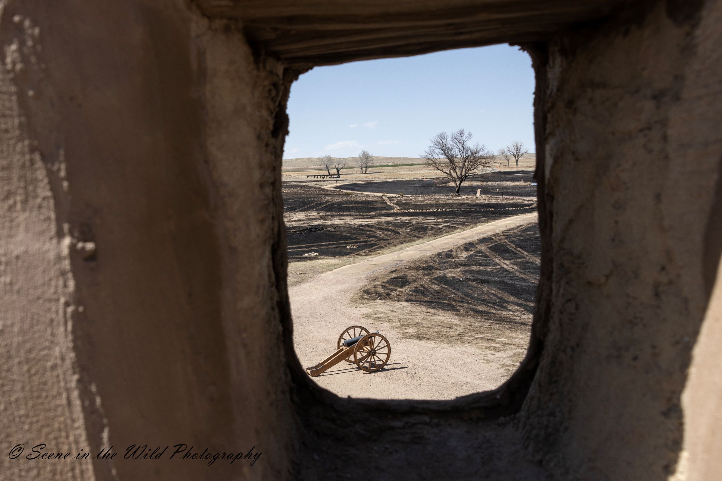 A view of the burn scar around the main path from one of the gun ports at Bents Old Fort National Historic Site. (Photo Credit: Sue Keefer)