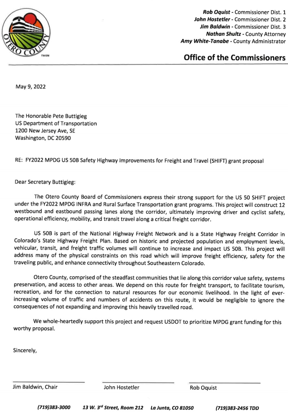"The Otero County Board of Commissioners express their strong support for the US 50 SHIFT project under the FY2022 MPDG INFRA and Rural Surface Transportation grant programs. This project will construct 12 westbound and eastbound passing lanes along the corridor, ultimately improving driver and cyclist safety, operational efficiency, mobility, and transit travel along a critical freight corridor."