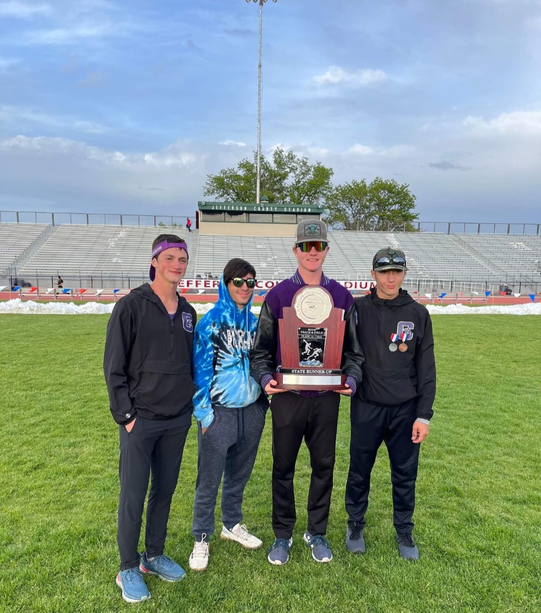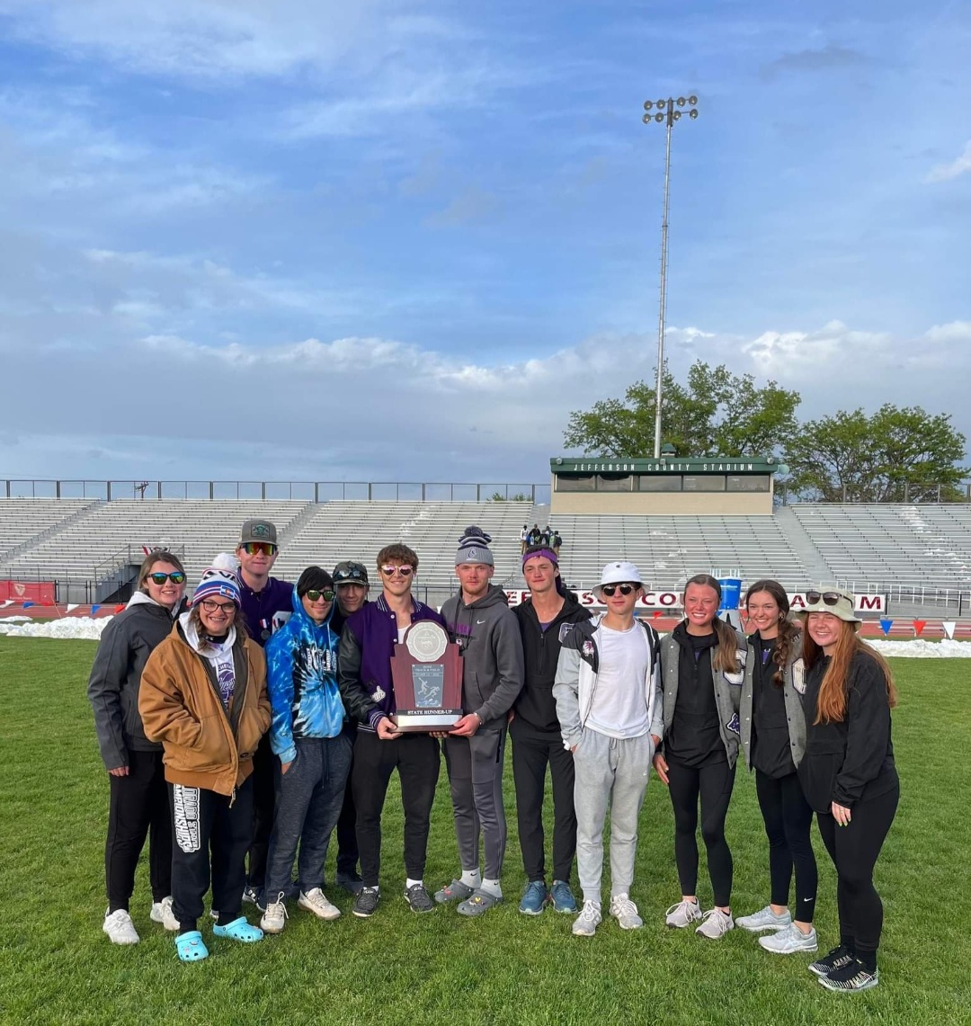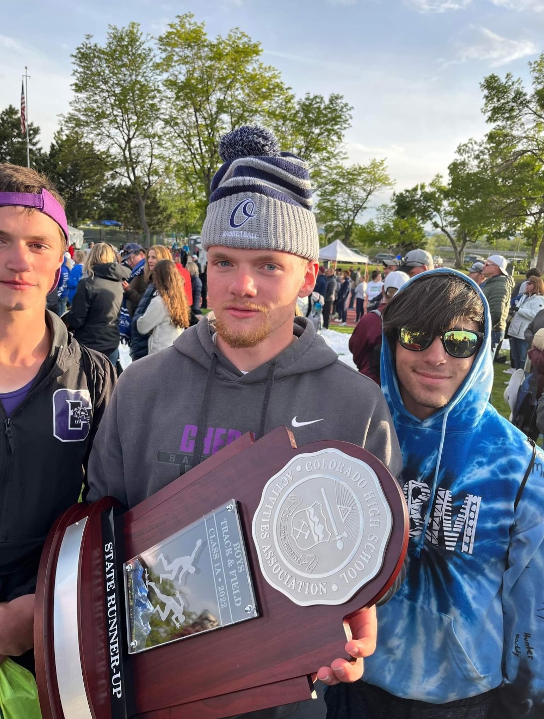 Description: 300M Hurdle CHSAA 1A State Champion Braeden Harris with his teammates holding the 1A Team State Championship runner-up trophy.