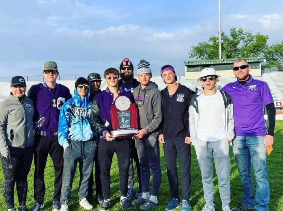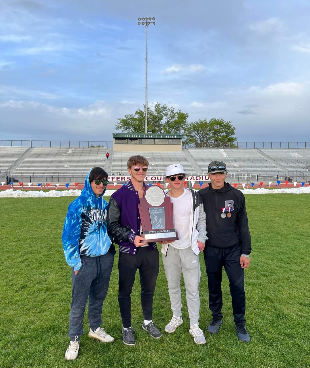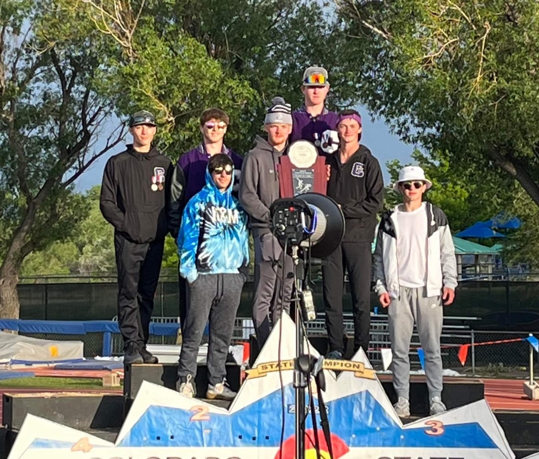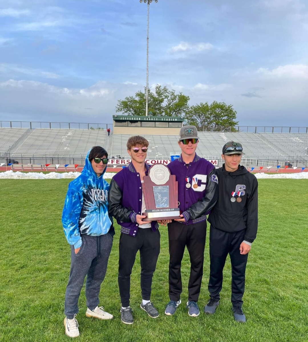 Description: 300M Hurdle CHSAA 1A State Champion Braeden Harris with his teammates holding the 1A Team State Championship runner-up trophy.