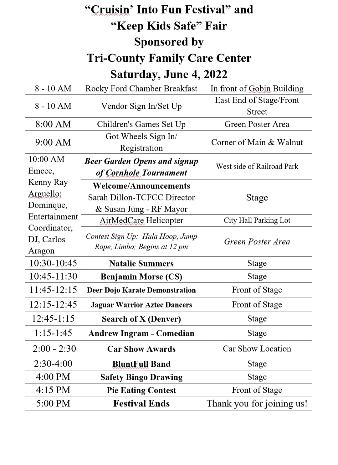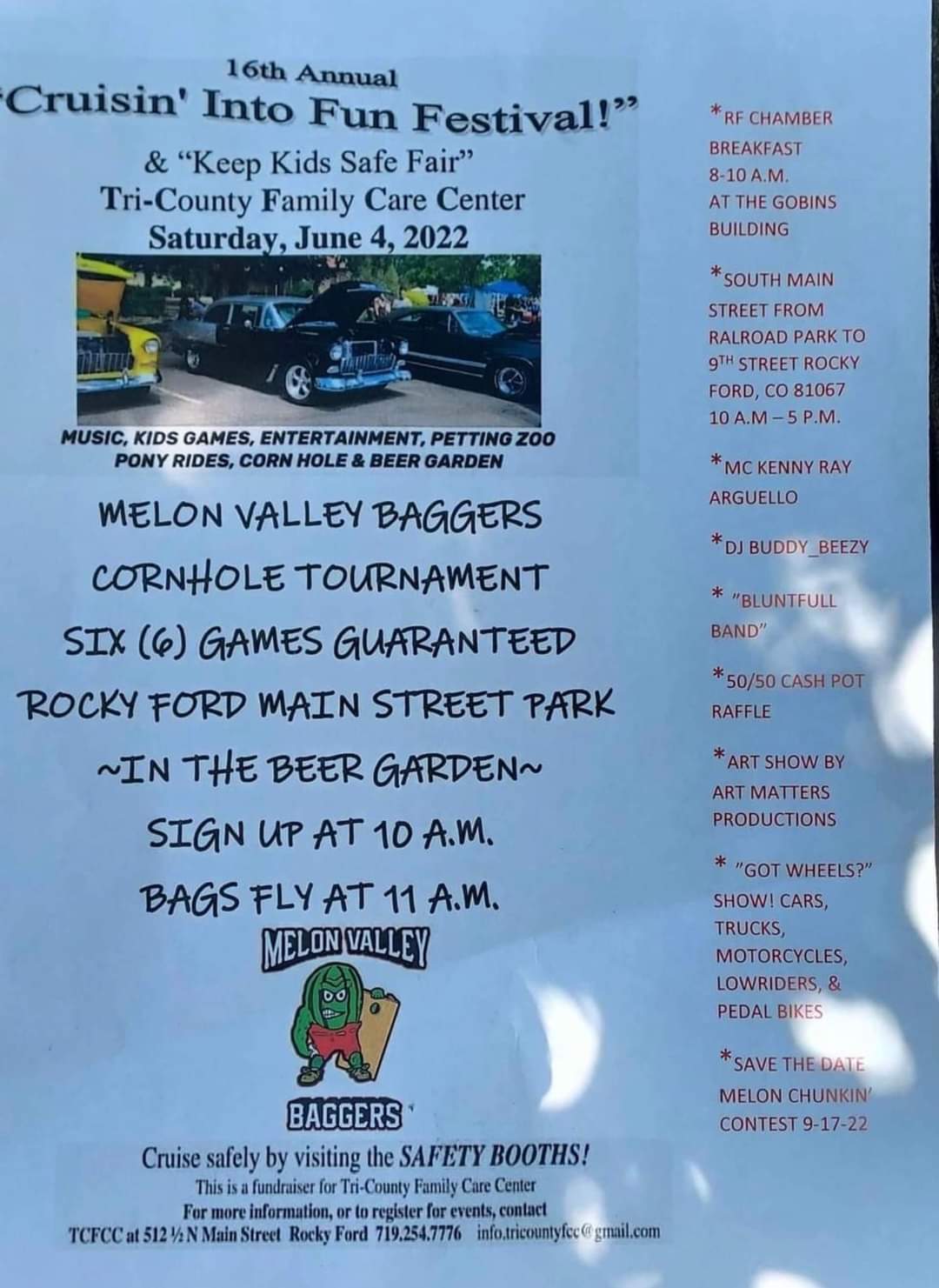 Description: Event Schedule for 16th Annual Tri-County Family Care Center Cruisin Into Fun June 4, 2022 in Rocky Ford, Colorado.