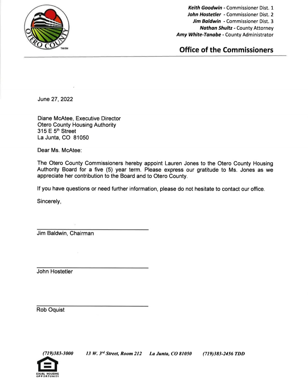 The Otero County Commissioners hereby appoint Lauren Jones to the Otero County Housing Authority Board for a five (5) year term. Please express our gratitude to Ms. Jones as we appreciate her contribution to the Board and to Otero County."