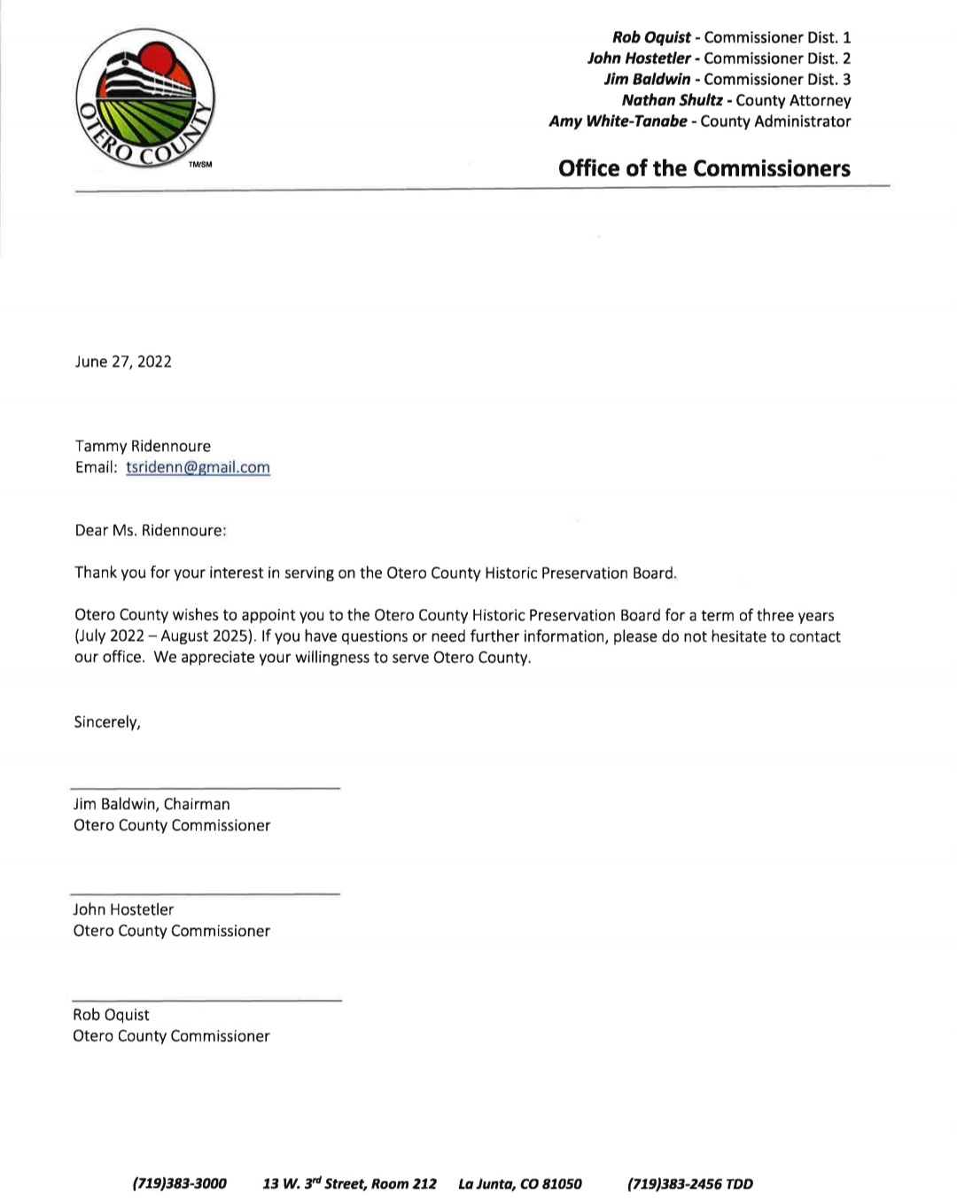 Otero County wishes to appoint you to the Otero County Historic Preservation Board for a term of three years