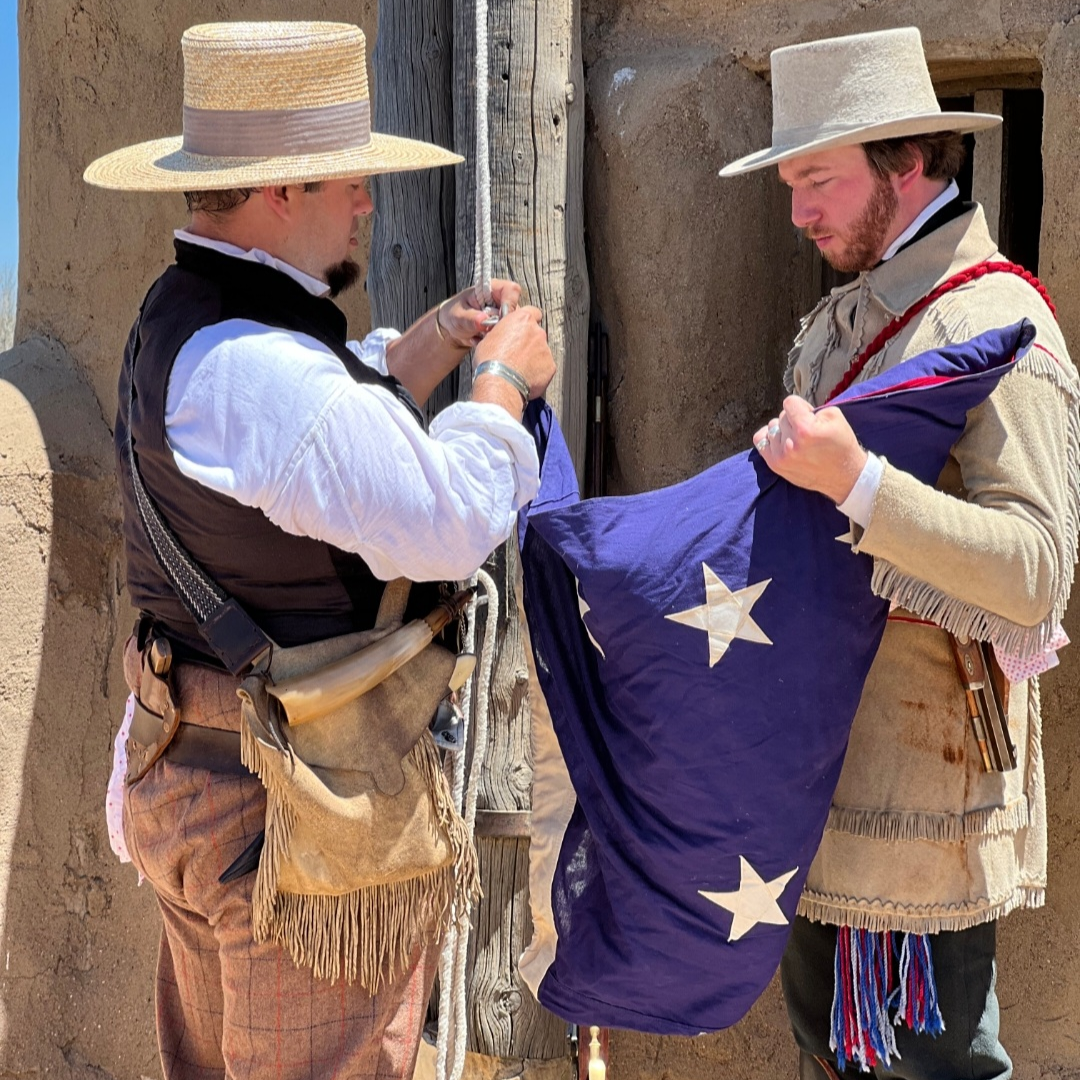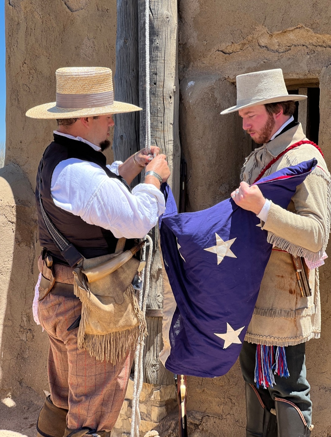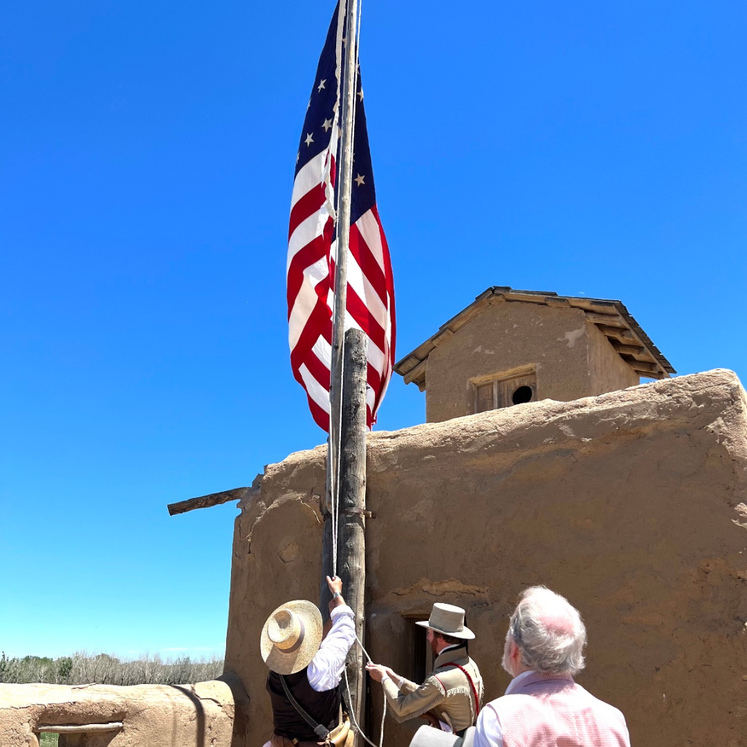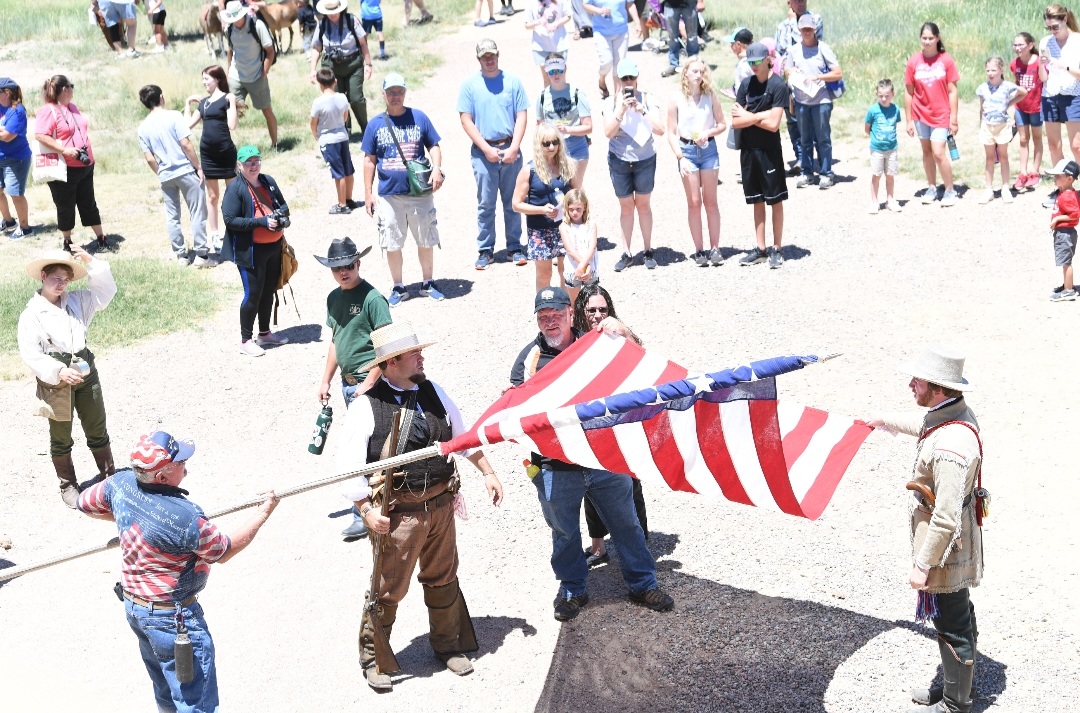 Description: Park Ranger Jake Koch (clerk/trader), Park Guide Eric Smallwood in leather coat (trader), and Volunteer-in-Park (VIP) J.R. Thompson (clerk/trader) raise a 27-star 1840's version of Old Glory over Bent's Old Fort. (Photo by Cindy Smith)