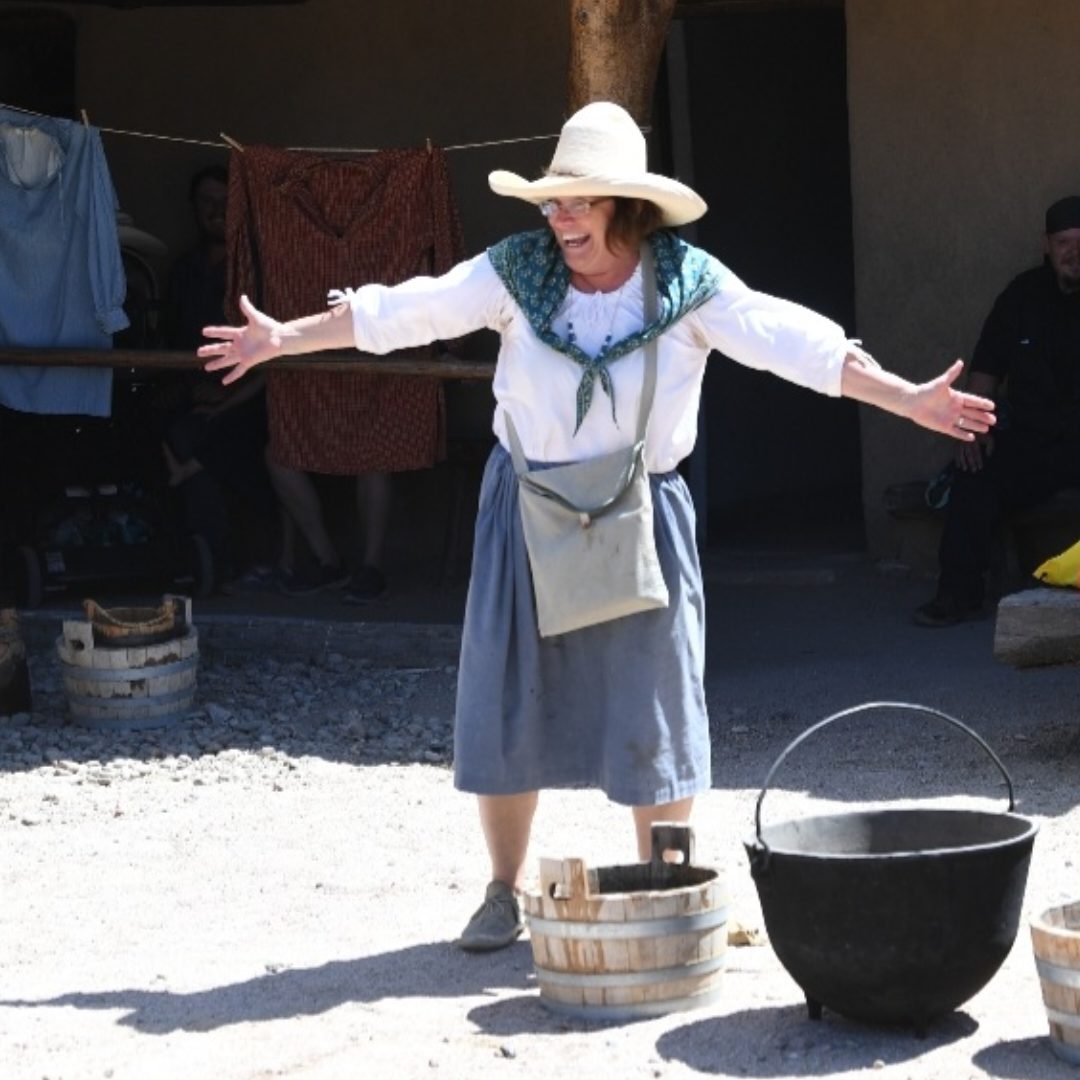 Volunteer Twyla Gomez in front left (laborer), Park Guide Eric Smallwood in back left (trader), Park Ranger Jake Koch in center (clerk/trader), Park Guide Mary Belew (laborer) and Park Guide Adan Muñoz on right (clerk/trader). (Photo By Cindy Smith)