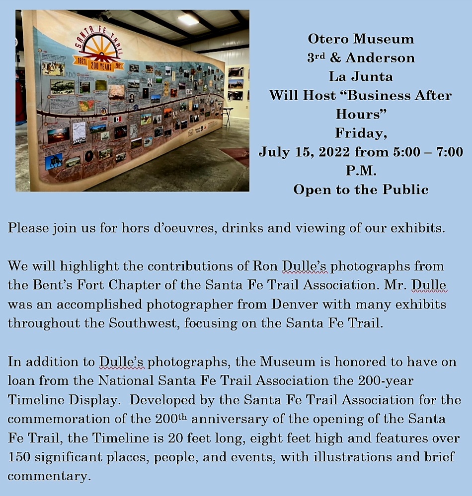 We will highlight the contributions of Ron Dulle’s photographs from the Bent’s Fort Chapter of the Santa Fe Trail Association. Mr. Dulle was an accomplished photographer from Denver with many exhibits throughout the Southwest, focusing on the Santa Fe Trail.