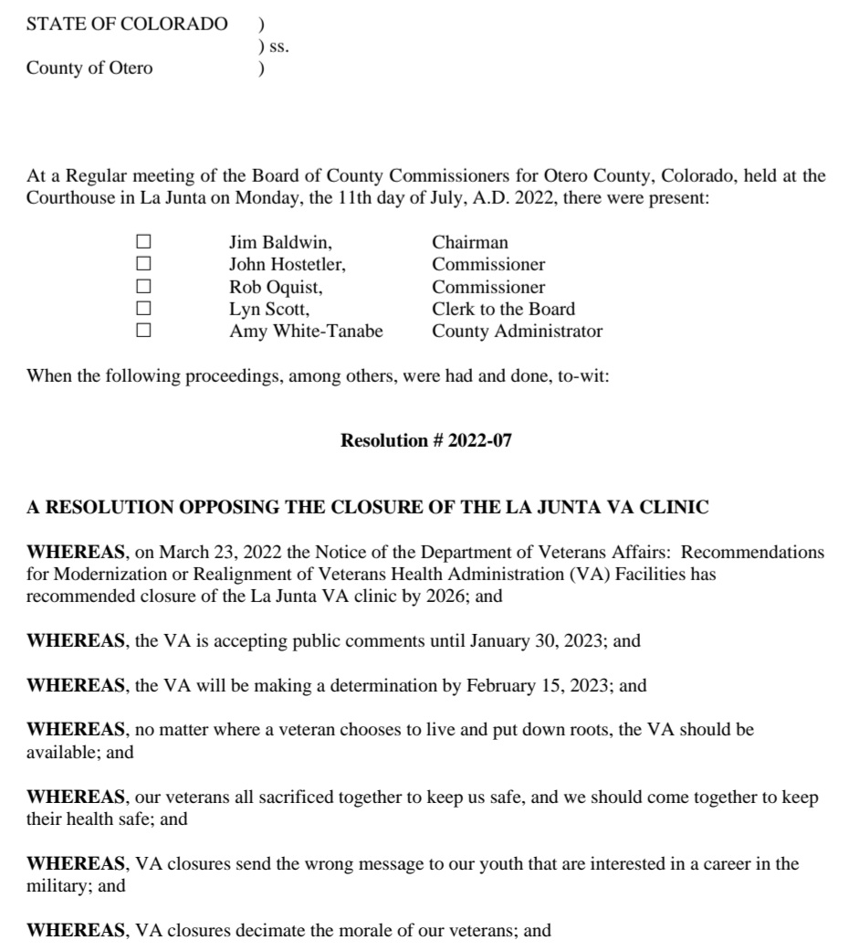 The Otero County Commissioners took action on a resolution opposing the closure of the La Junta VA Clinic during their regular public hearing on Monday, July 11, 2022.