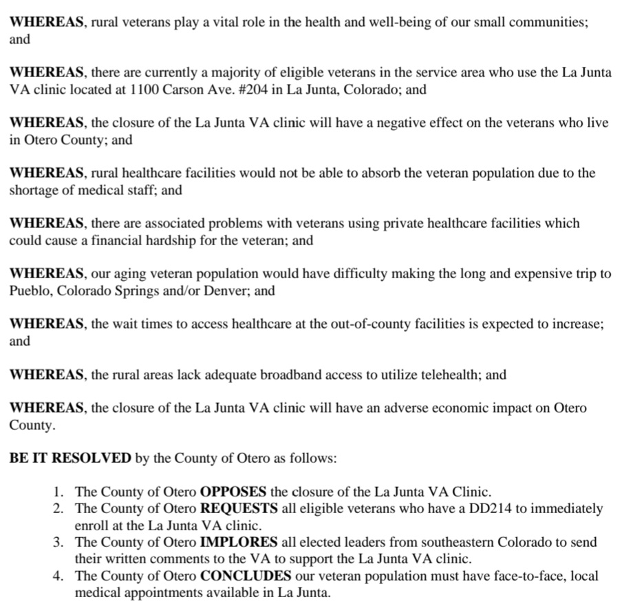 WHEREAS, the closure of the La Junta VA clinic will have a negative effect on the veterans who live in Otero County; and