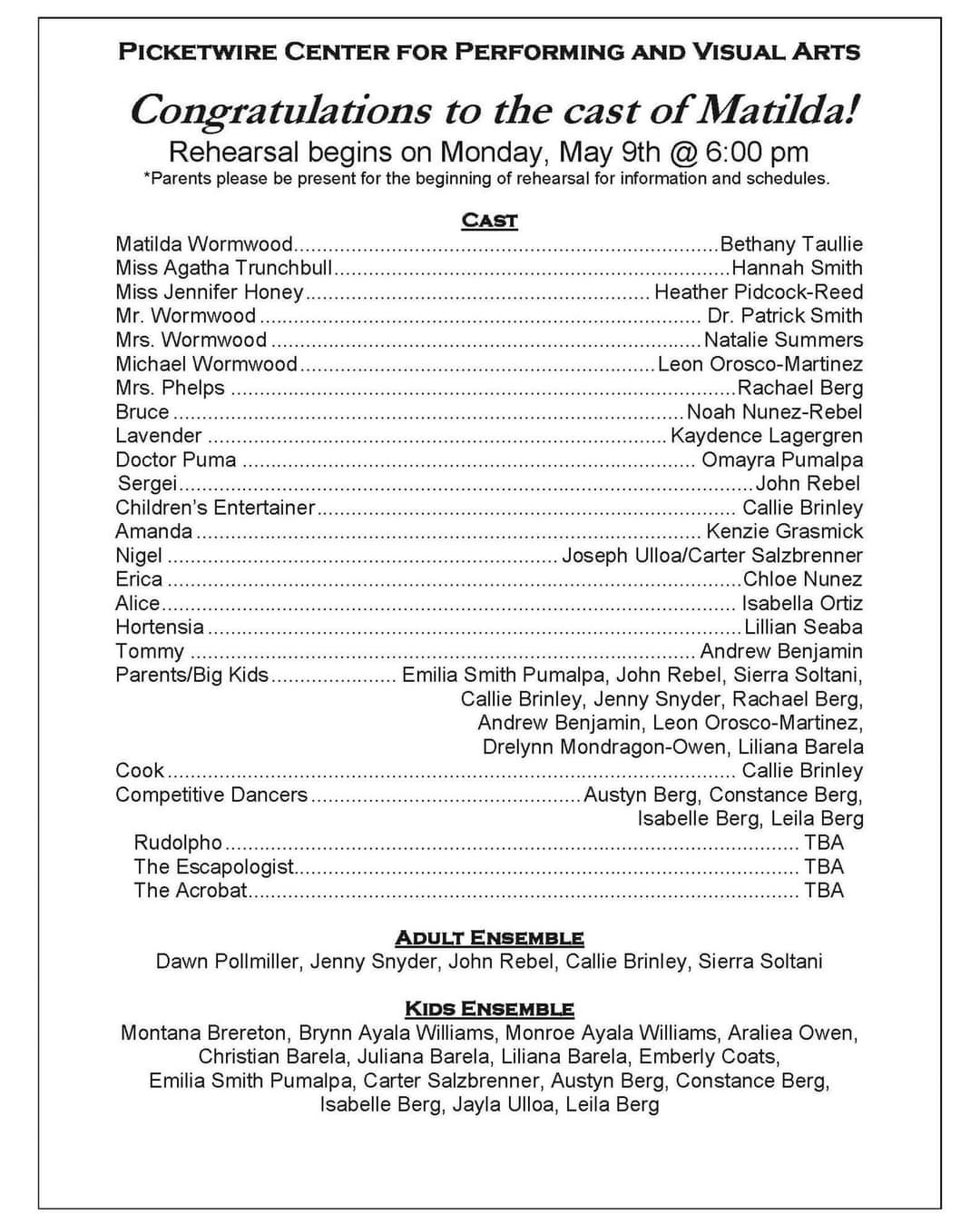 Picketwire Players Announce Matilda Cast