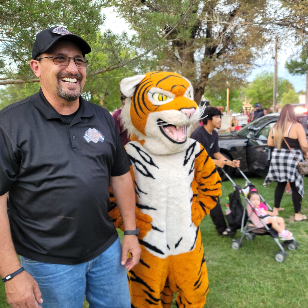 La Junta Chief of Police Todd Quick with the La Junta High School Tiger Mascot.