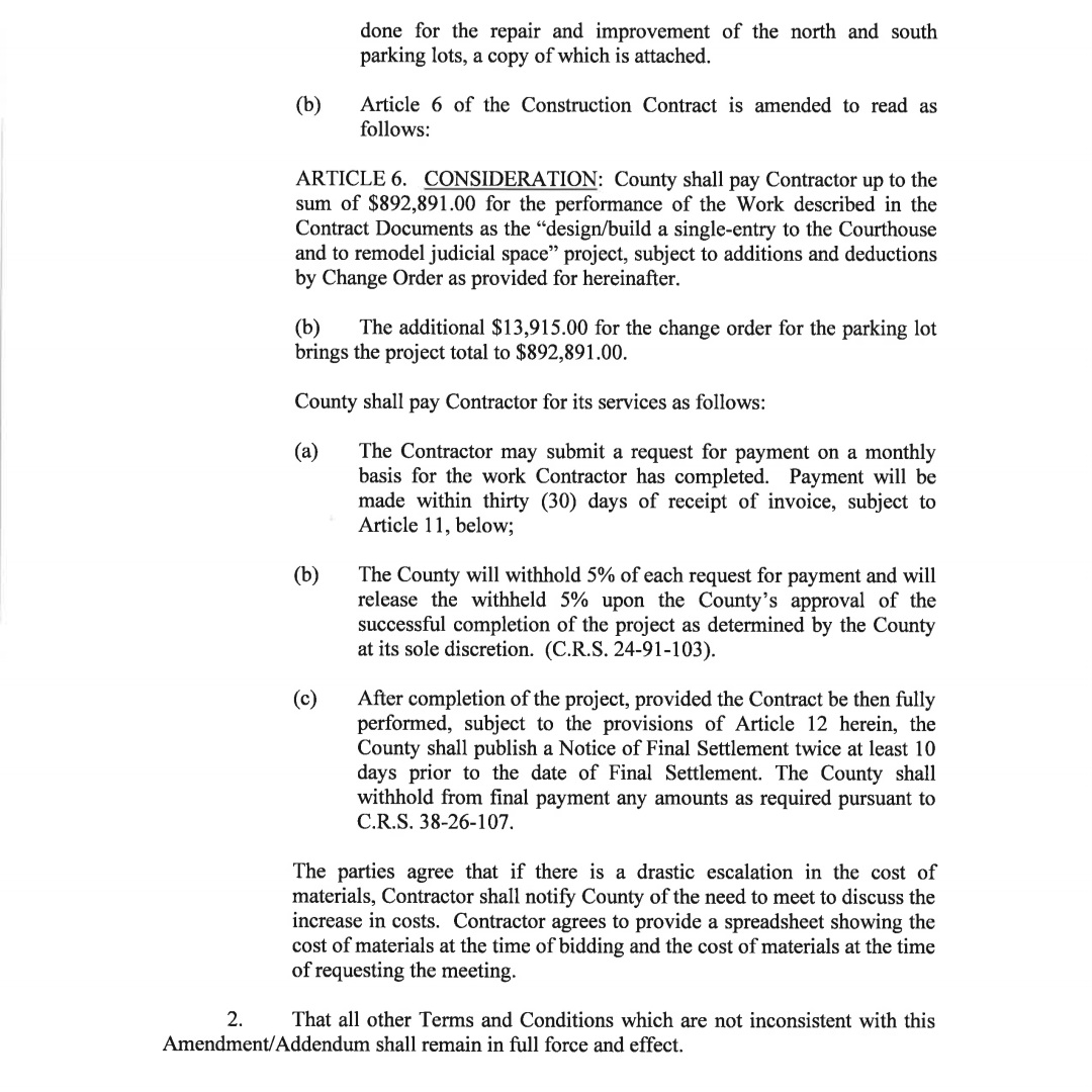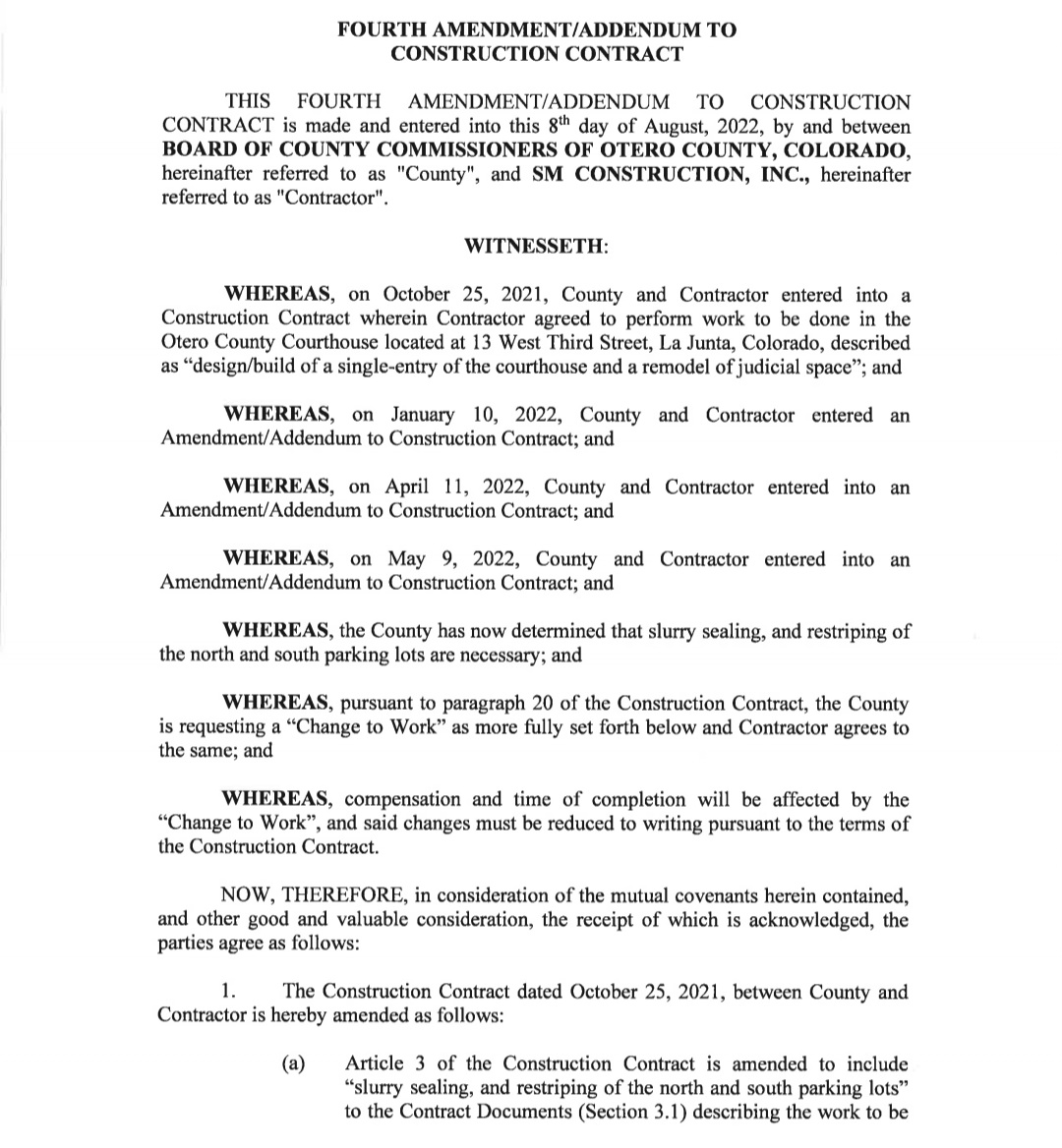 The commissioners approved the 4th amendment to the contract with SM Construction. Essentially, the amendment added the North and South Parking Lot Repairs adding $13,915 worth of improvements to the single-entry point and magistrates office construction project, and brought the total project expense to $892,891, which is still under budget, according to Otero County Administrator Amy White-Tanabe.