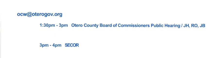 The Otero County Commissioners John Hostetler and Rob Oquist reported that they had attended several meetings and mentioned the chip and seal projects ongoing for Otero County.