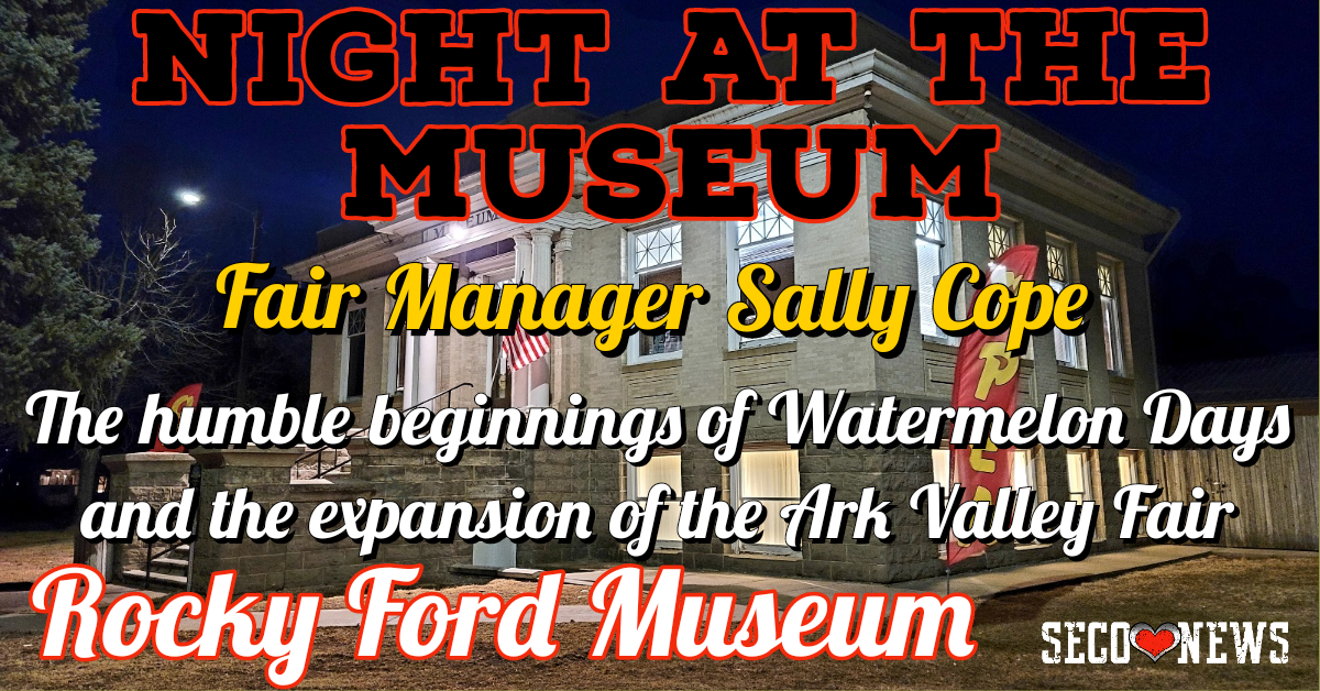 The Rocky Ford Museum invites you to join them at the Arkansas Valley Fair August 17 - 20 in the Exposition Building. While there they will be displaying history films including Livestream footage of the Night at the Museum with Sally Cope and Jeannie Swink Johannes and the history of the watermelon pile and Arkansas Valley Fair.