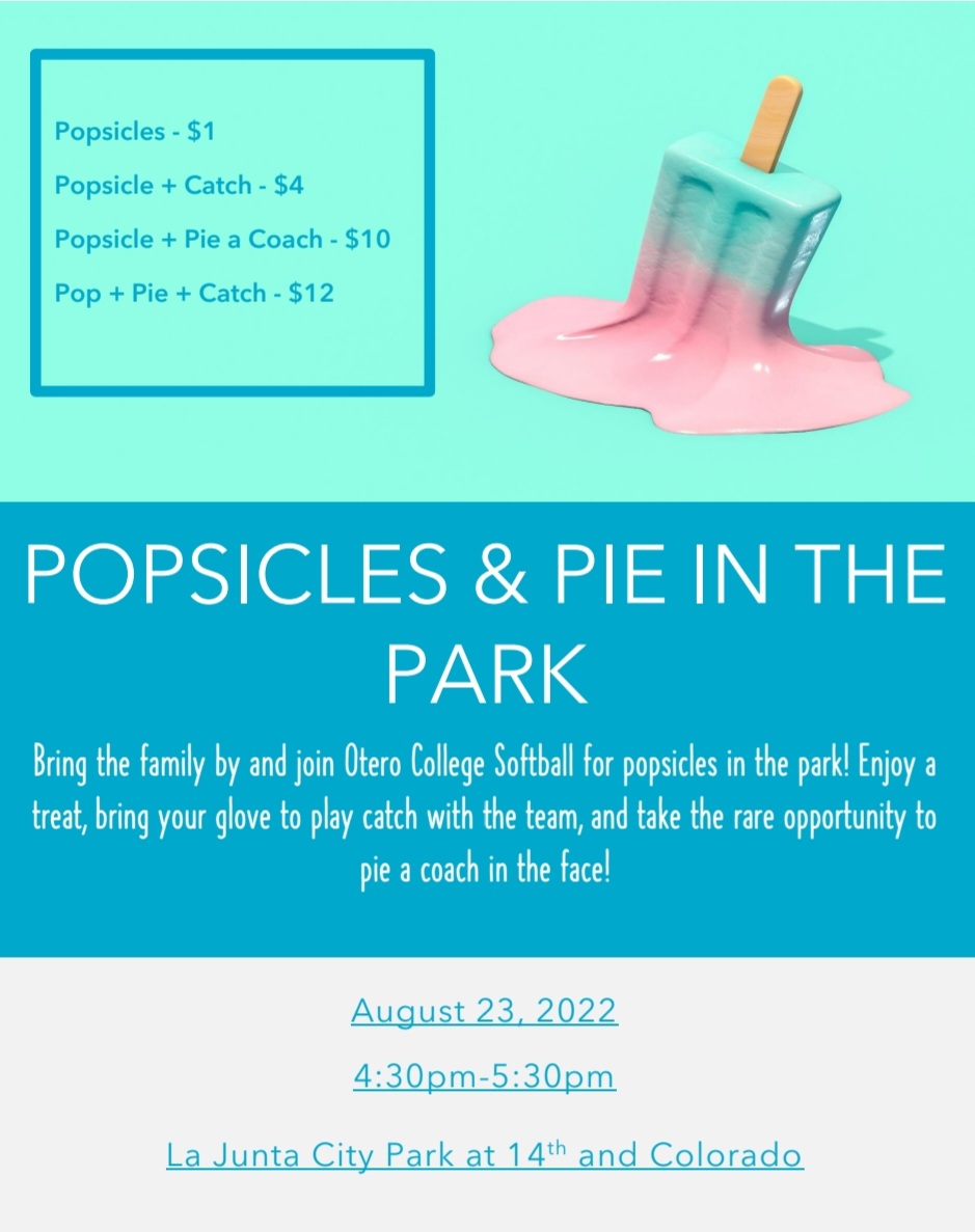 Bring the family by and join Otero College Softball for popsicles in the park! Enjoy a treat, bring your glove to play catch with the team, and take the rare opportunity to pie a coach in the face!