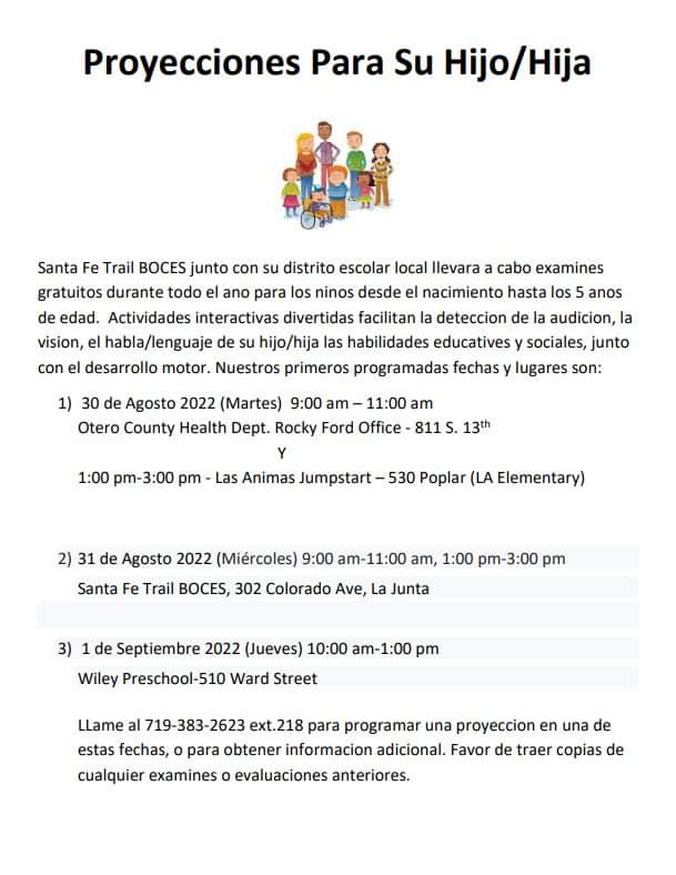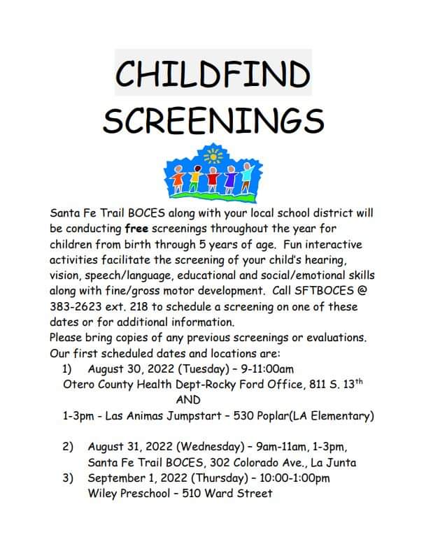 Santa Fe Trail BOCES along with your local school district will be conducting free screenings throughout the year for children from birth through 5 years of age.
