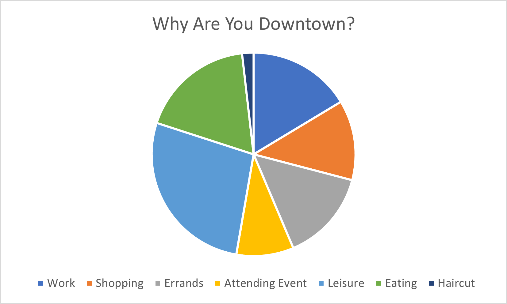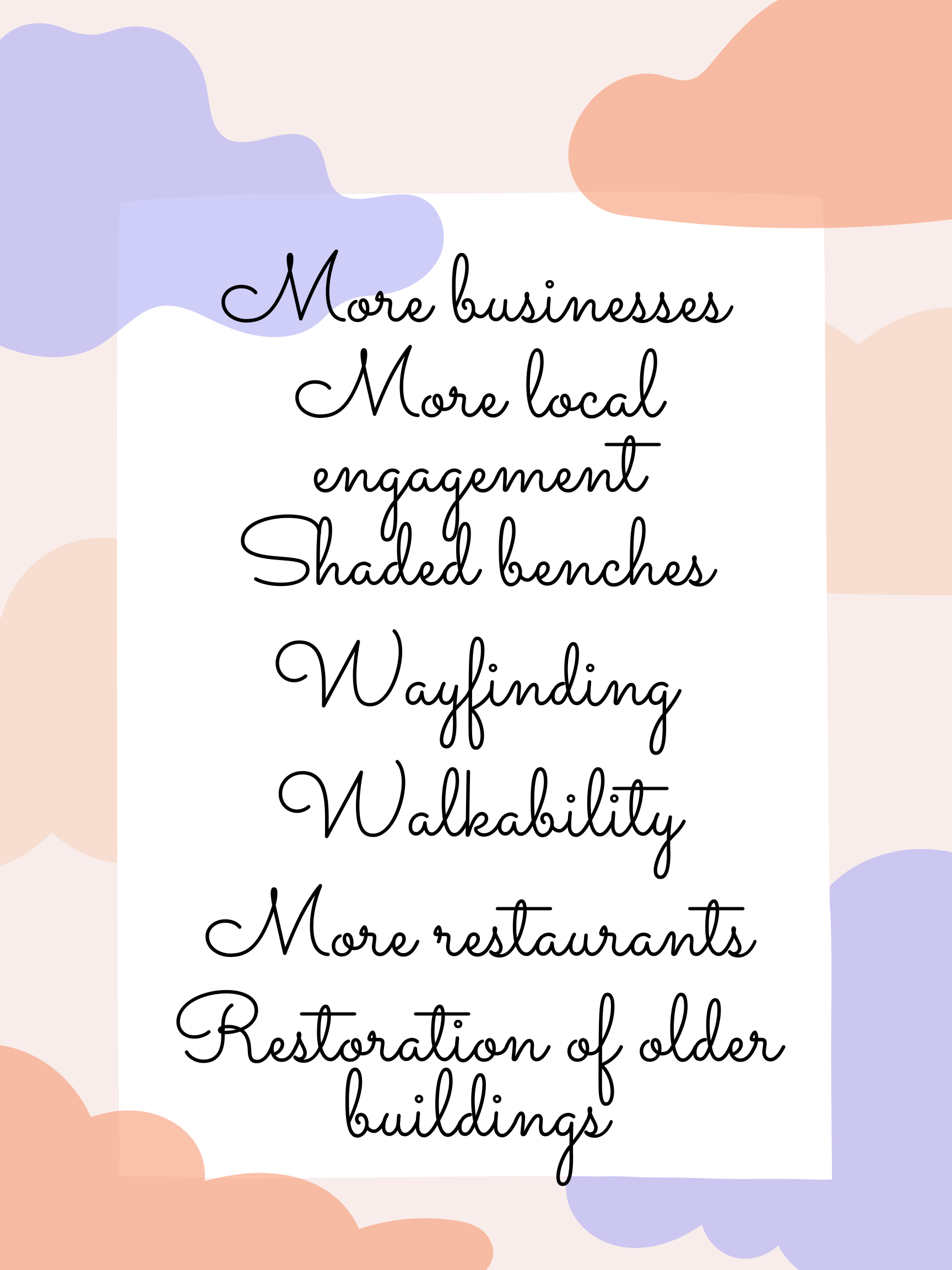 · Under “Desired Changes,” locals wanted more businesses, more local engagement, shaded benches, wayfinding, walkability, more restaurants, and restoration of older buildings.