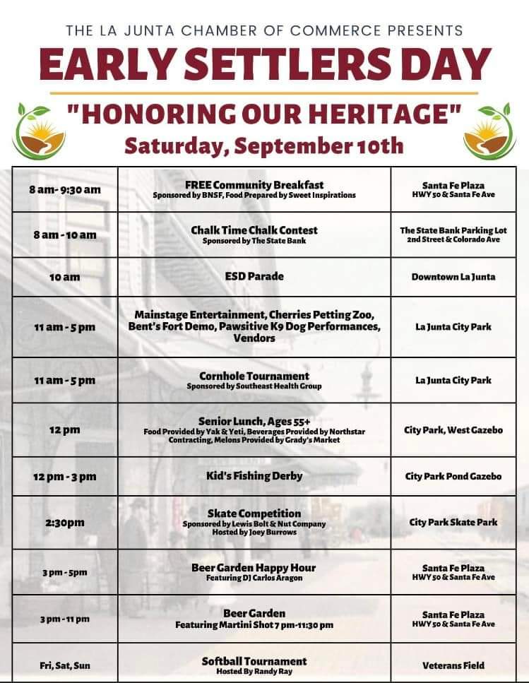 Description: The La Junta Chamber of Commerce invites you to join them in a day of entertainment this Early Settler's Day September 10, 2022 in La Junta.
