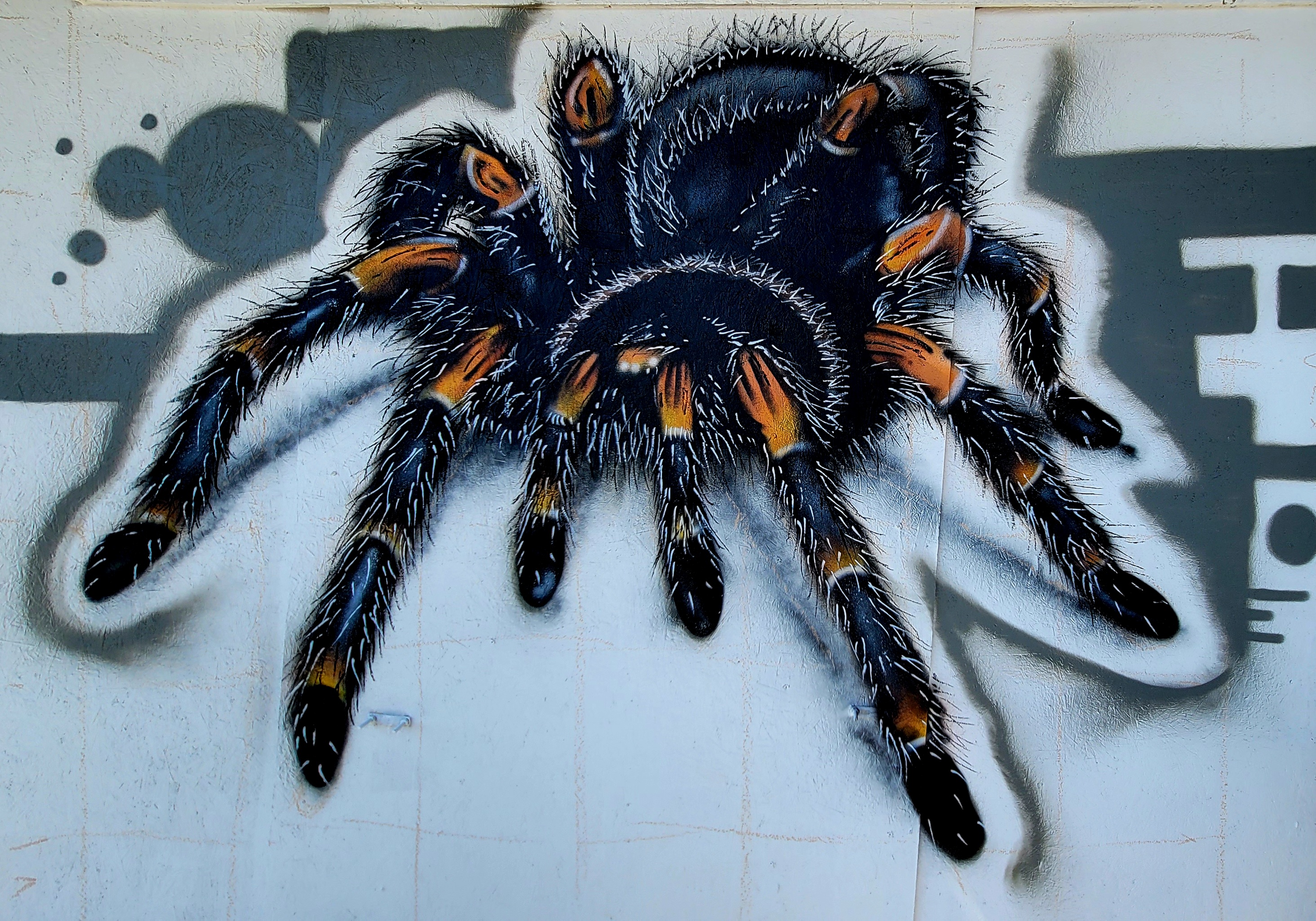 This (incomplete) Tarantula Mural by Zeke Ayala is on a temporary background and will be up for a limited time, see the final piece in person on Colorado Ave. in La Junta before it crawls away.