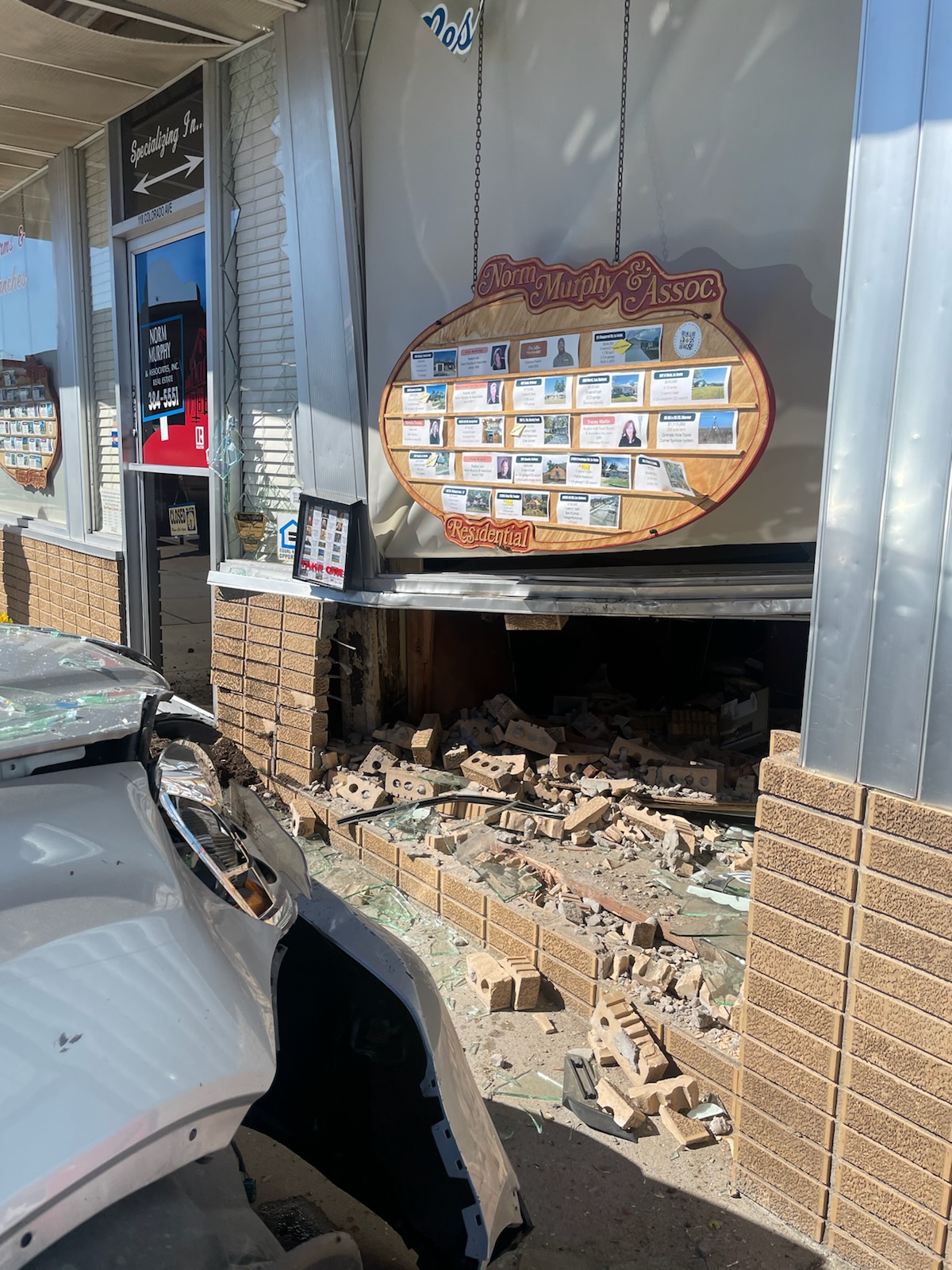 Both the vehicle and the building sustained damage, but there were no injuries and Norm Murphy continues to do business as usual.