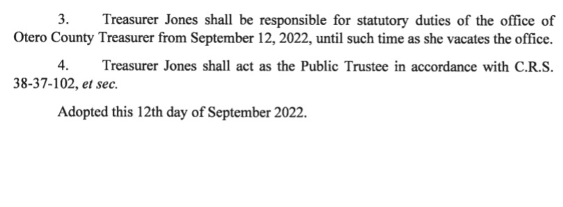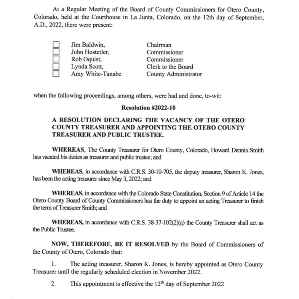 f. Resolution 2022-10 A Resolution Declaring the Vacancy of the Otero County Treasurer and Appointing the Otero County Treasurer and Public Trustee.