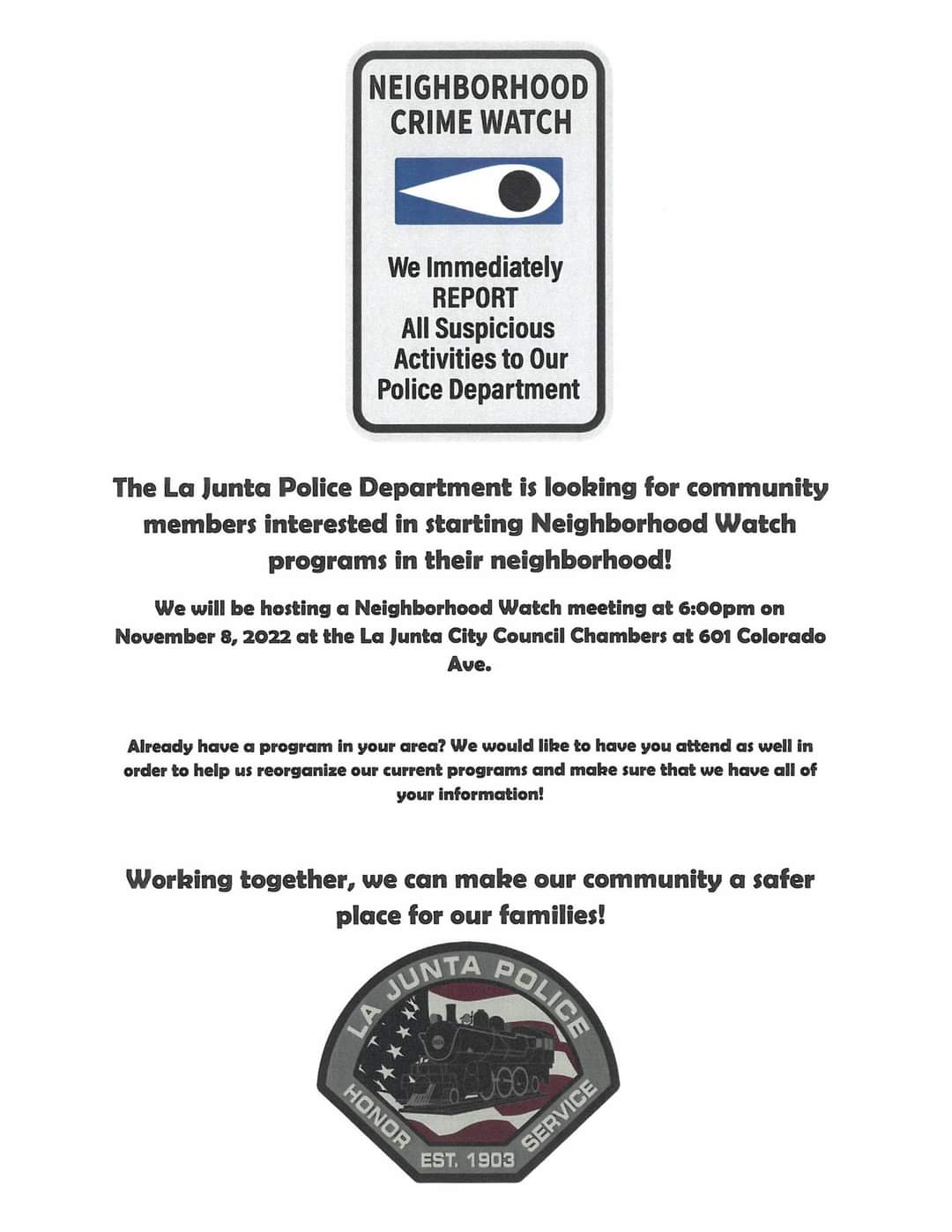 Description: We will be hosting a Neighborhood Watch meeting at 6:00pm on November 8, 2022 at the La Junta City Council Chambers at 601 Colorado Ave.
