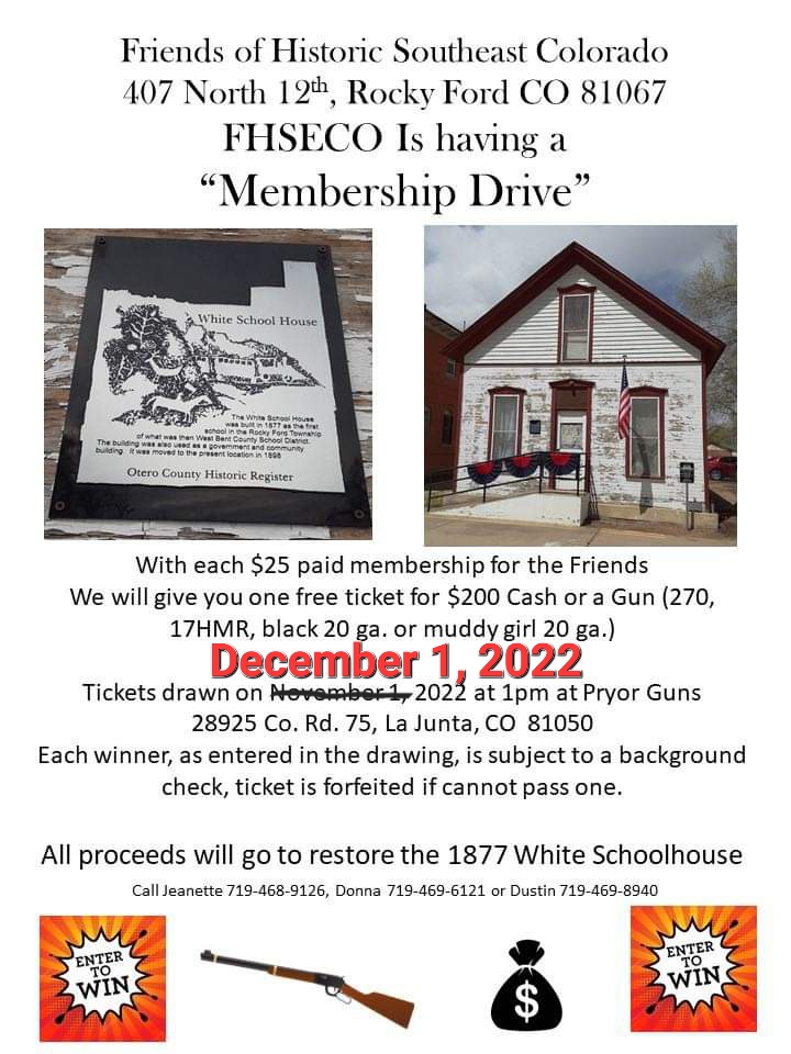 Description: The Entry Deadline is extended! Support the Friends of Historic Southeast Colorado Membership Drive by Joining Today. Call Jeanette 719-468-9126, Donna 719-469-6121 or Dustin 719-469-8940.
