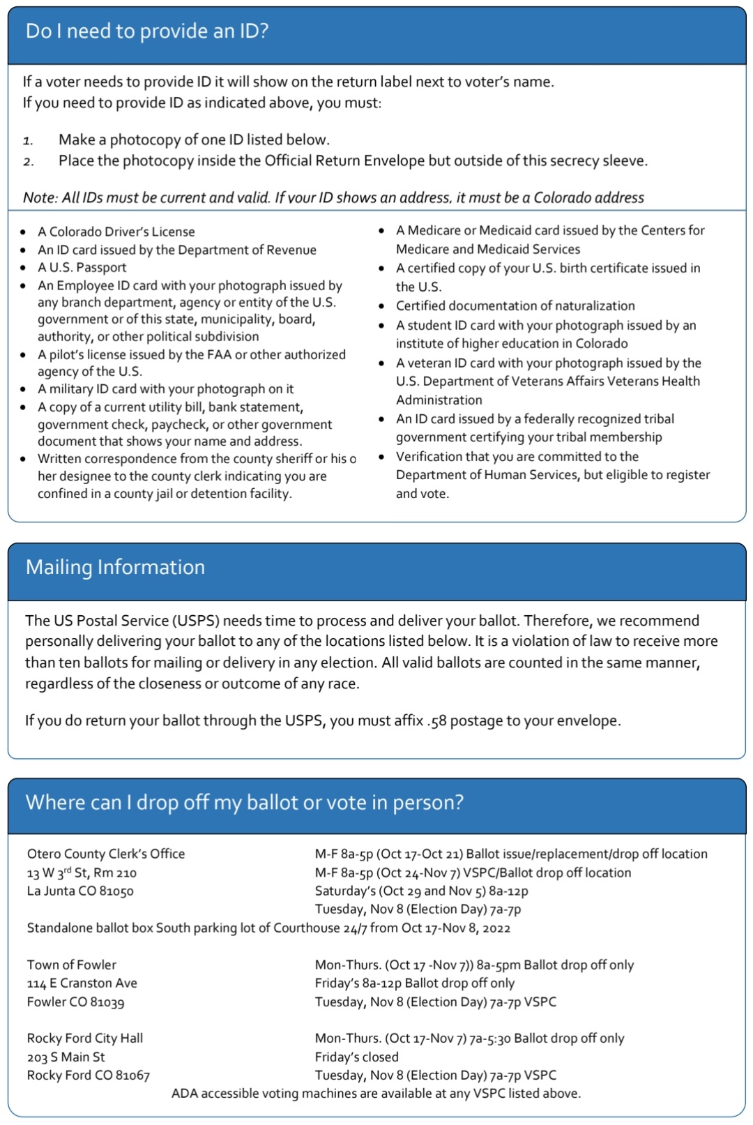 Rocky Ford City Hall Mon-Thurs. (Oct 17-Nov 7) 7a-5:30 Ballot drop off only