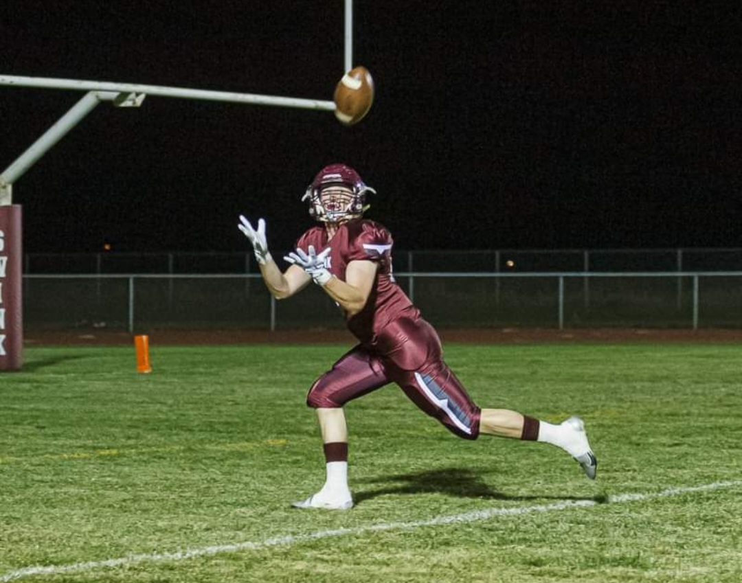 Junior Jackson Tomky catches a long pass from Quarterback Hunter Bauserman at the Swink High School Headley Athletic Complex.