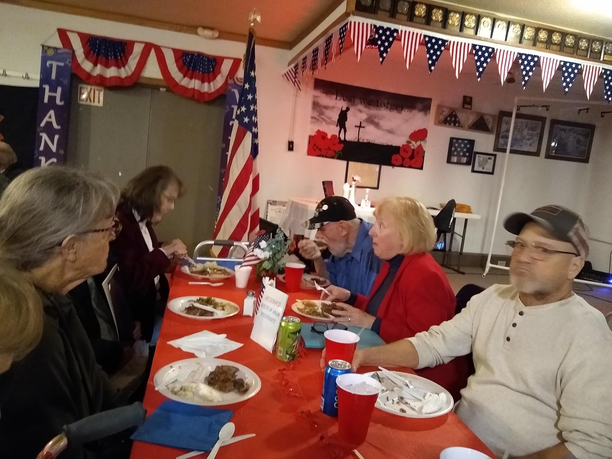 Marilyn Hagans (in the red jacket) made the Quilts of Valor and is enjoying dinner with the recipients. It was a packed house and a wonderful ceremony honoring our nations Veterans.