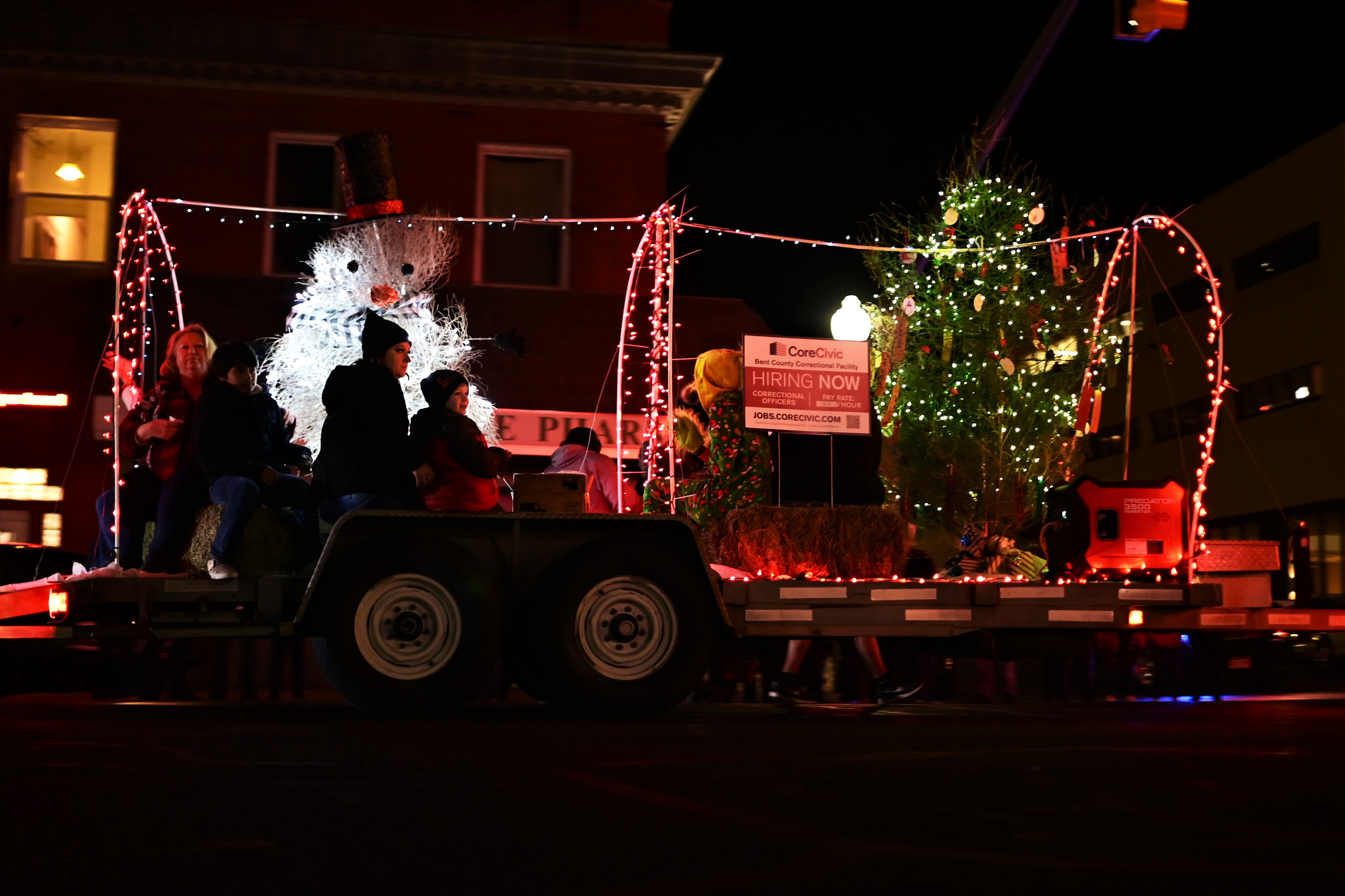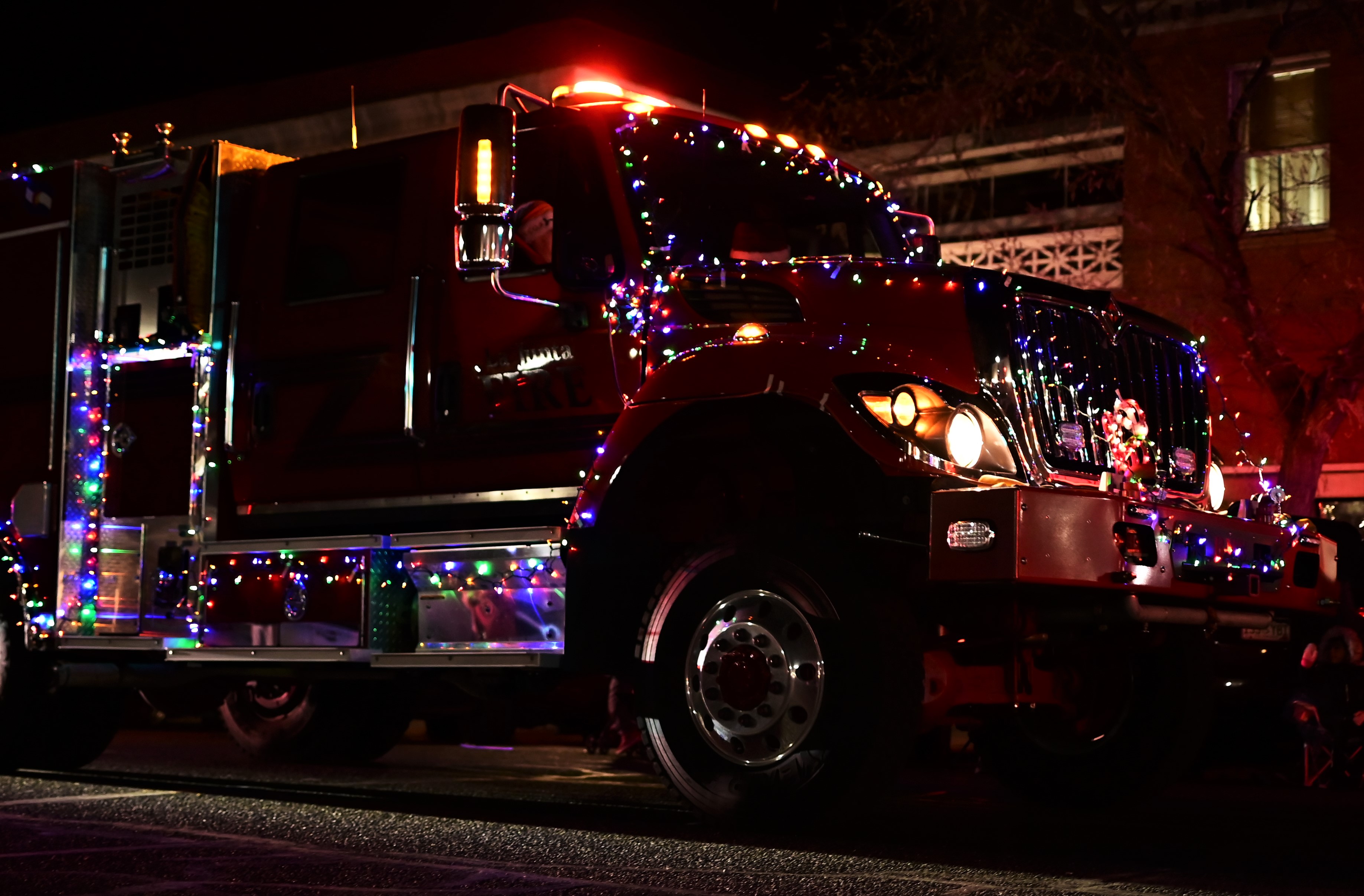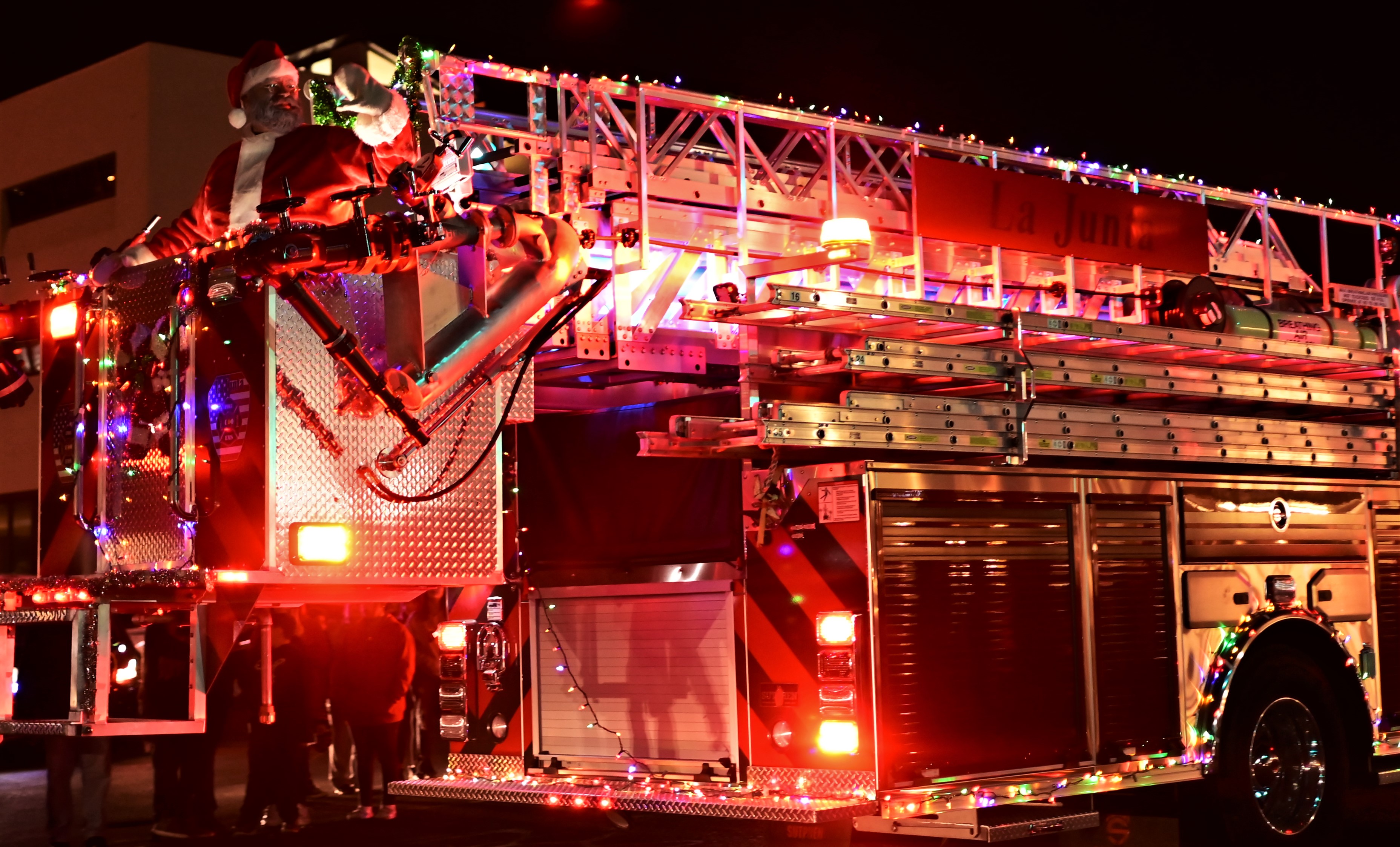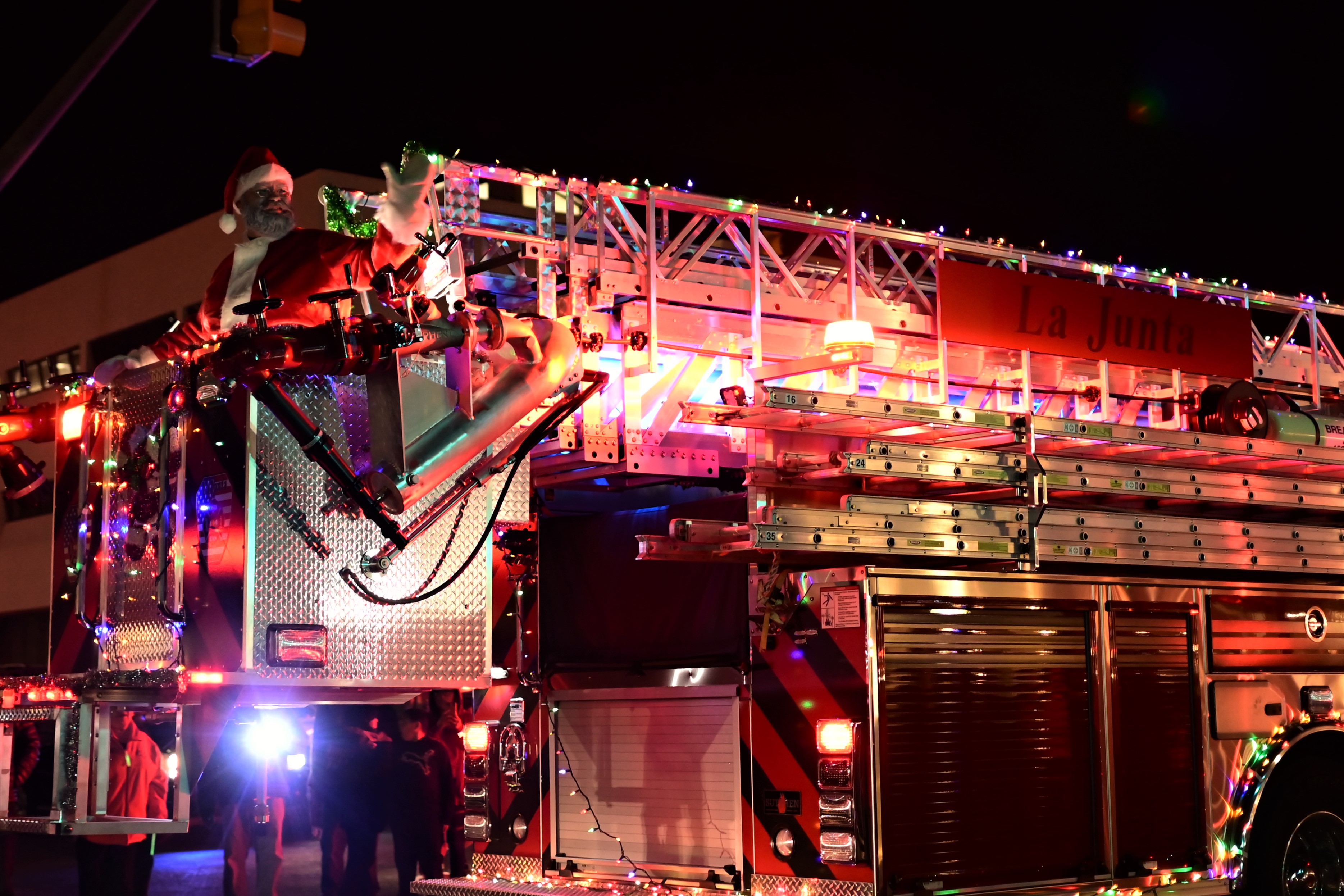 Description: Santa Claus rode in style in the bucket on the La Junta Fire Department's Sutphen Fire Truck. (Photo by Kaitlyn Myers) Press Play to Watch the Parade and Tree Lighting Mixdown Video by Billy Jackson.