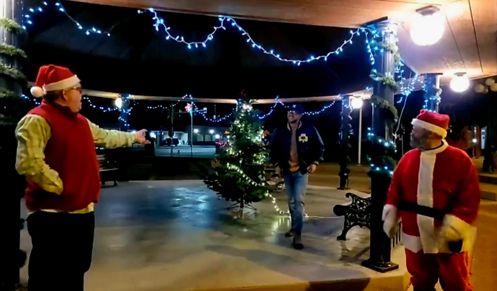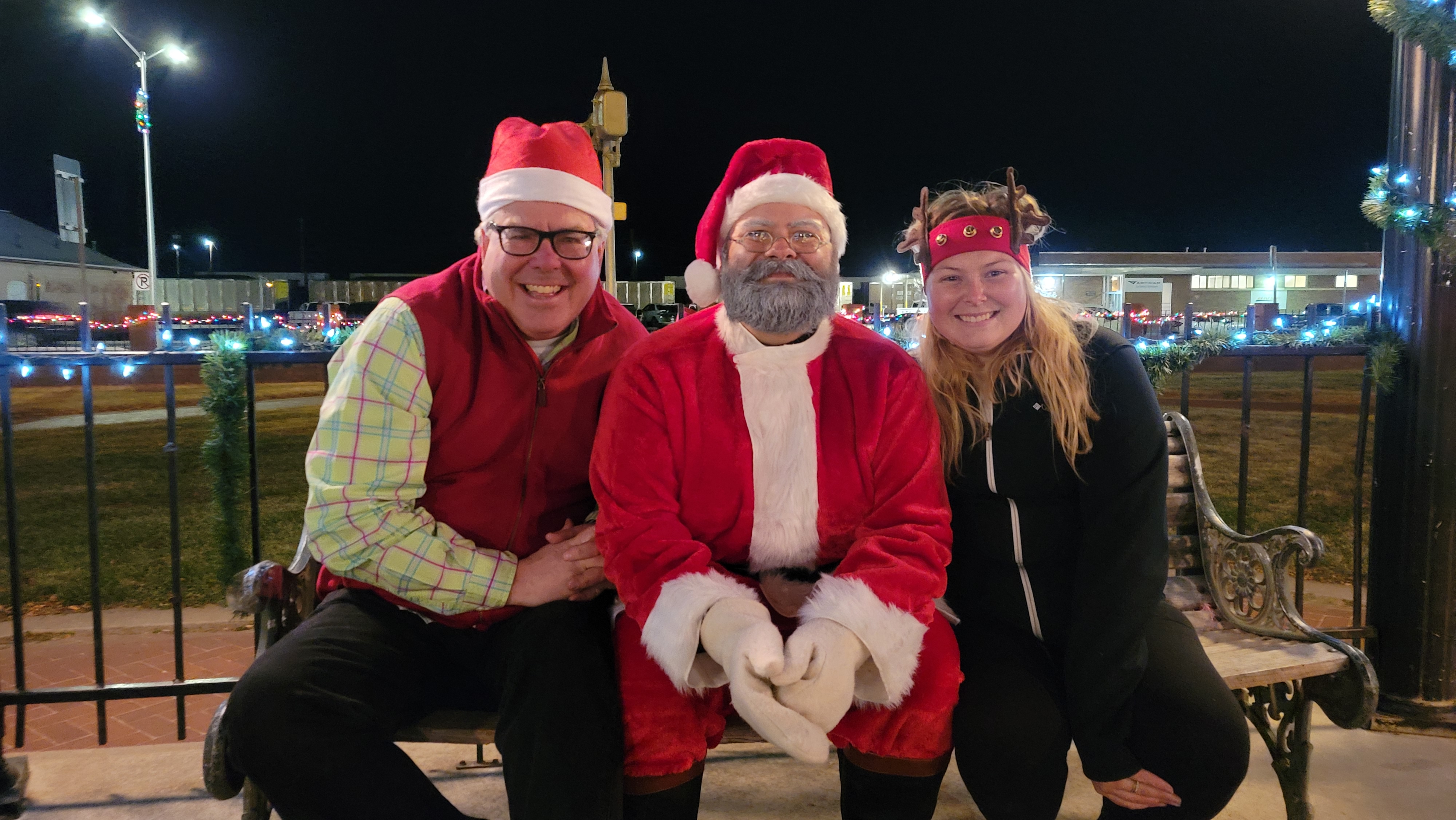 La Junta Chamber of Commerce President Greg Kolomitz, Chris Kringle, and Chamber Manager Timmery Foster pose for a pic under the Santa Fe Plaza Gazebo Saturday night. (Photo by Adrian Hart)