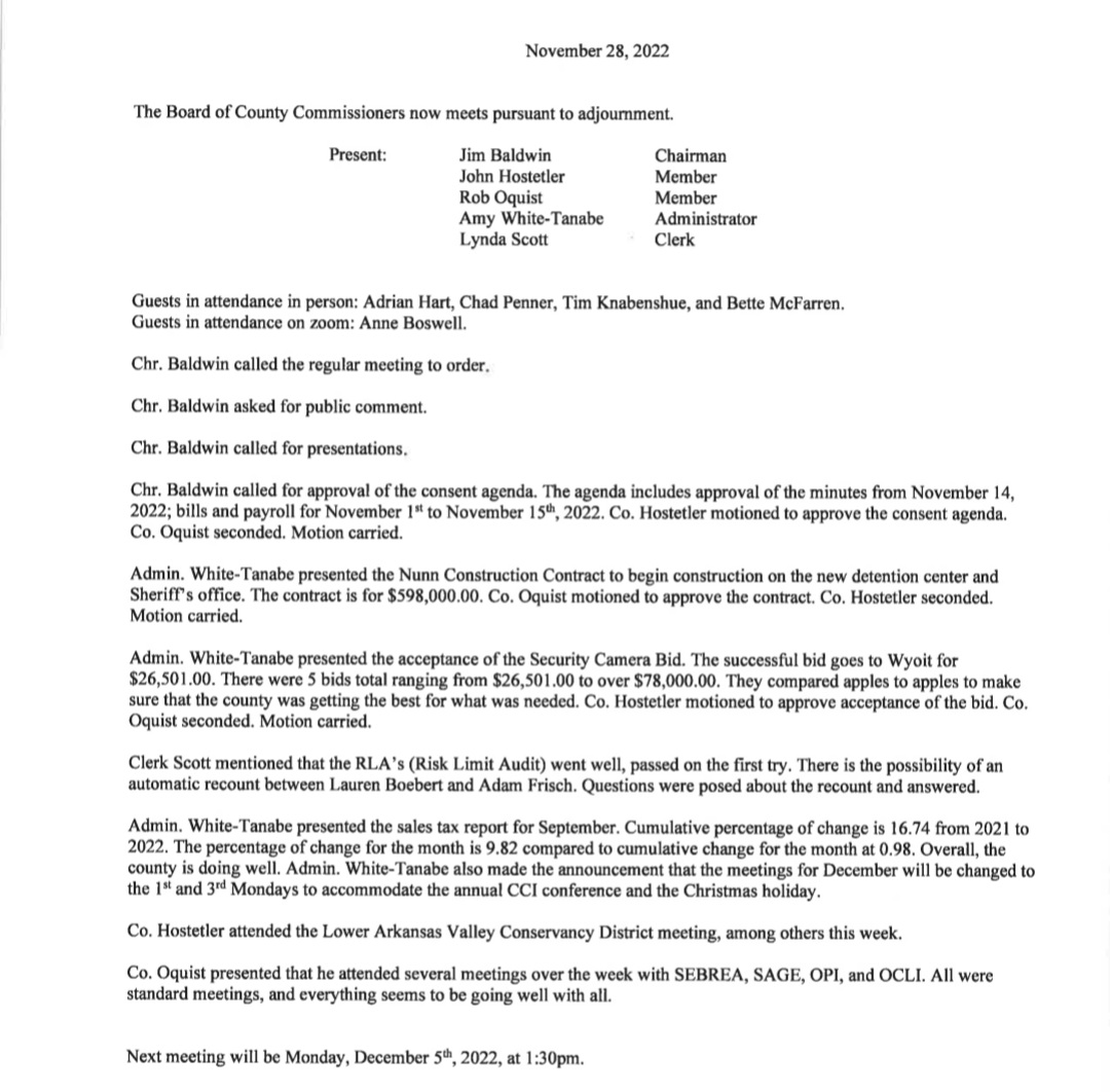 As part of the consent agenda items, the Otero County Commissioners approved their minutes from their previous meeting on November 28, 2022.