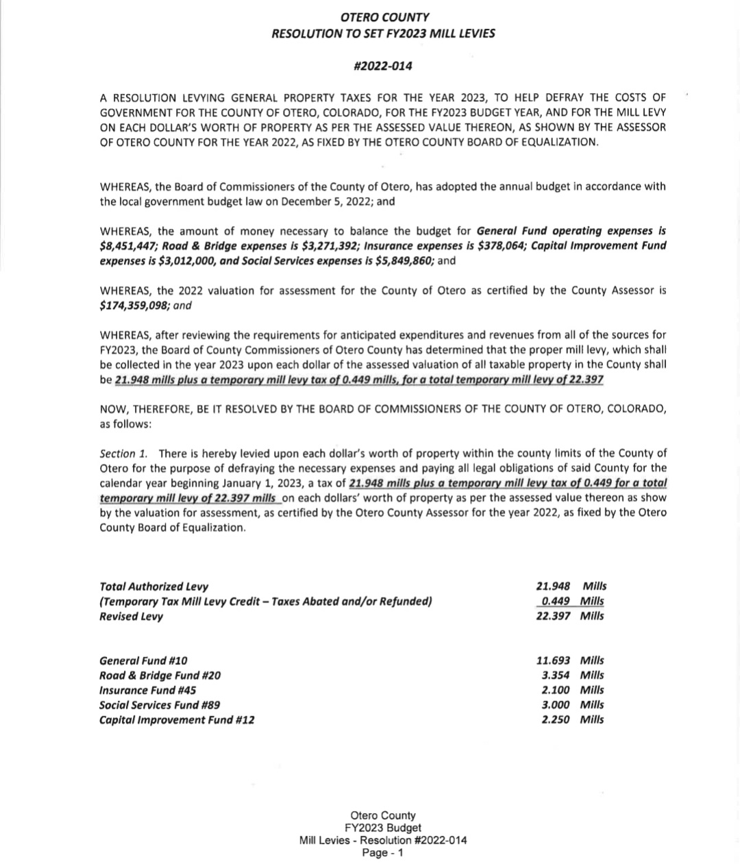 The Otero County Commissioners unanimously passed Resolution 2022-14, setting the Mill Levies, and establishing the county property taxes for 2023.