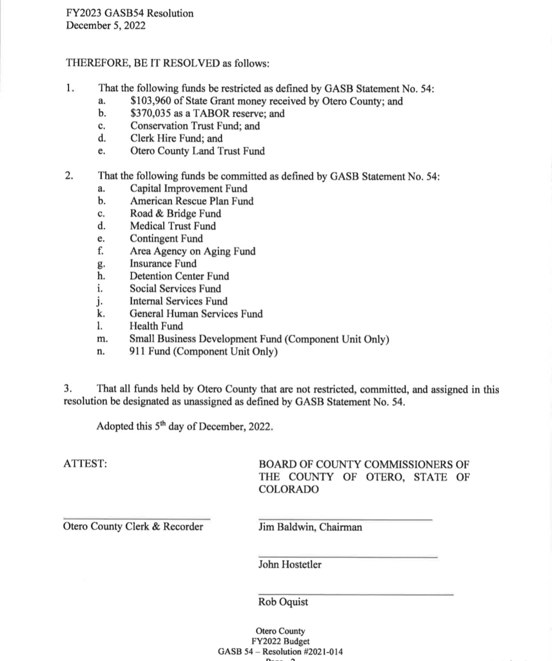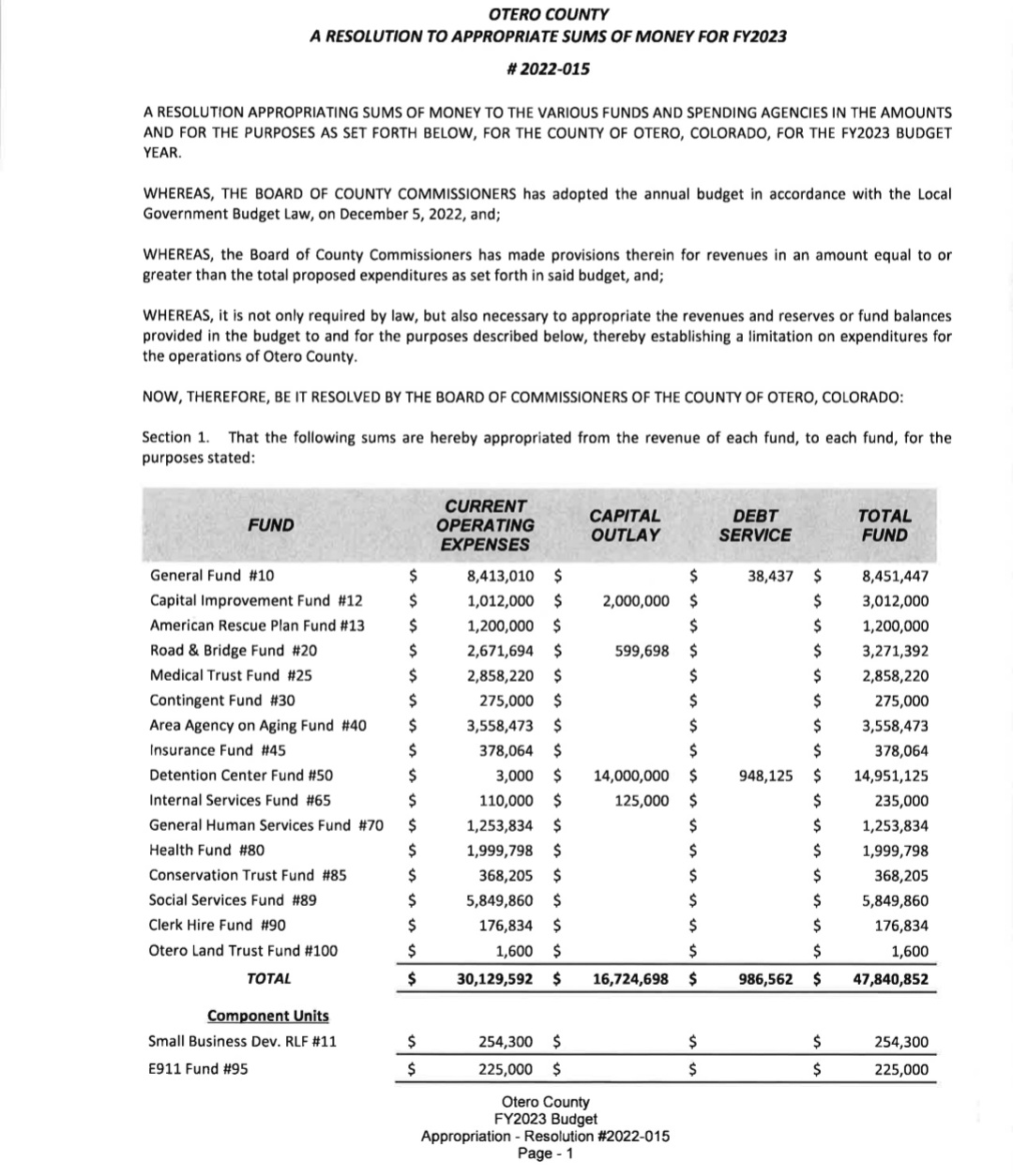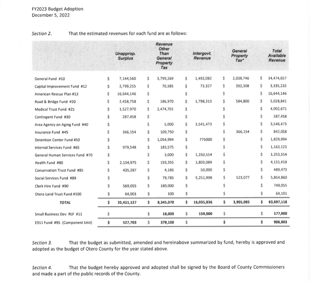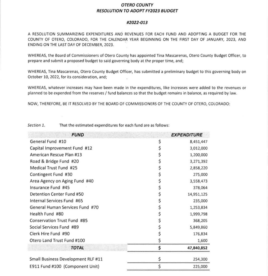 The Otero County Commissioners passed Resolution 2022-13, adopting the 2023 Budget.