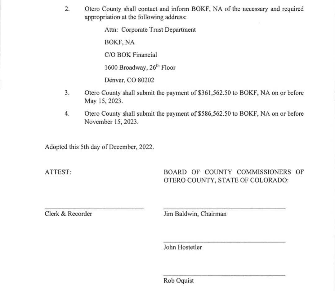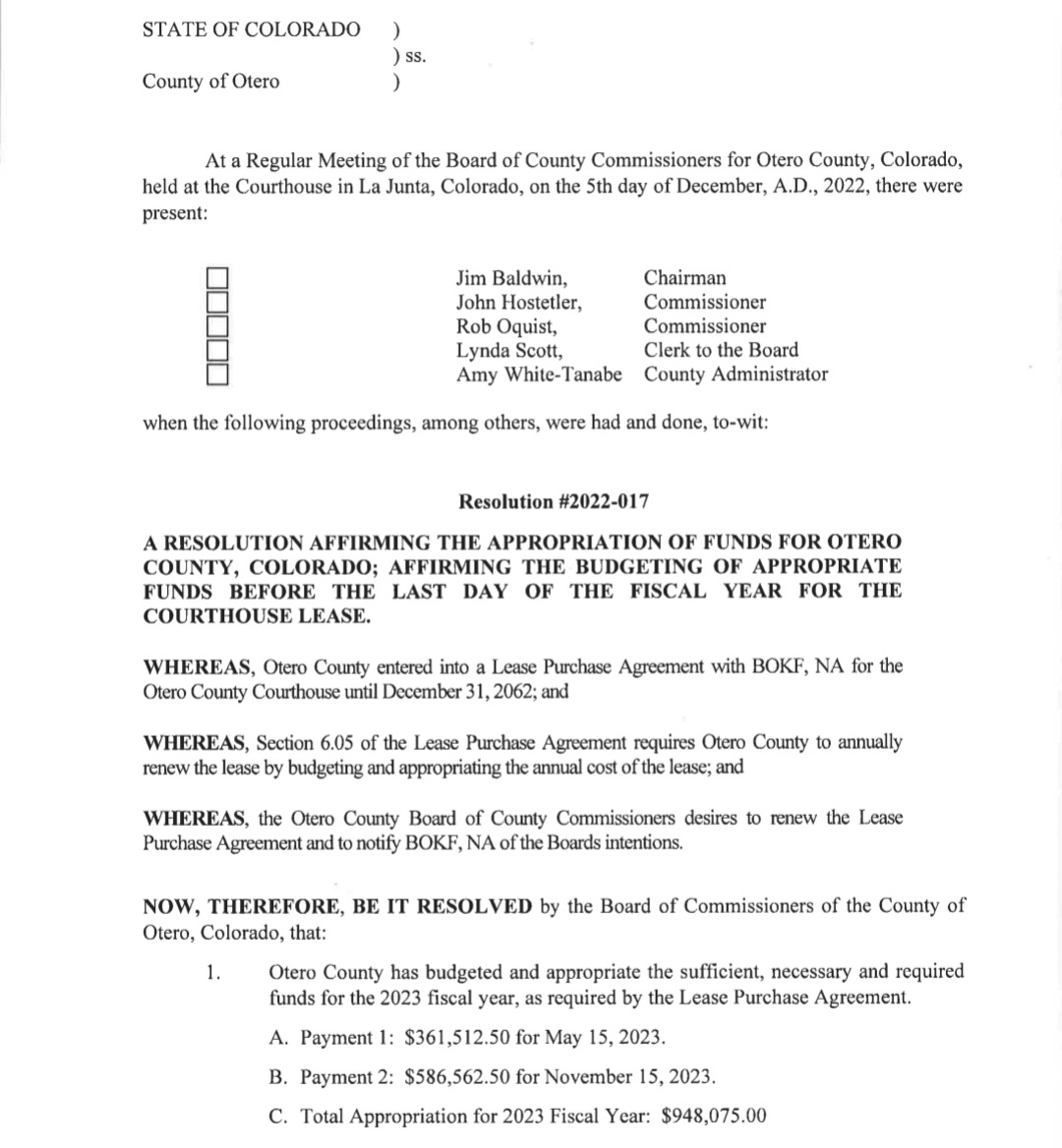 The Otero County Commissioners passed Resolution 2022-17, regarding allocation of funds for the Otero County Courthouse lease payments.