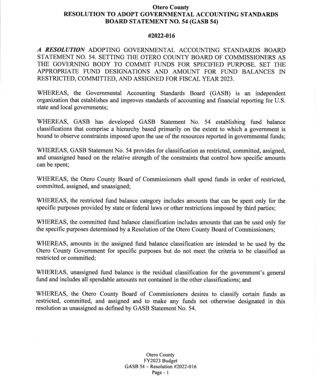 The Otero County Commissioners passed Resolution 2022-16, which adopted accounting standards for fiscal year 2023.