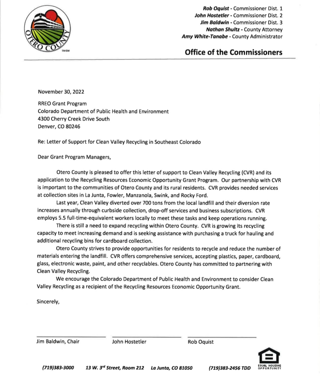 The Otero County Commissioners Signed a Letter of Support for Clean Valley Recycling.