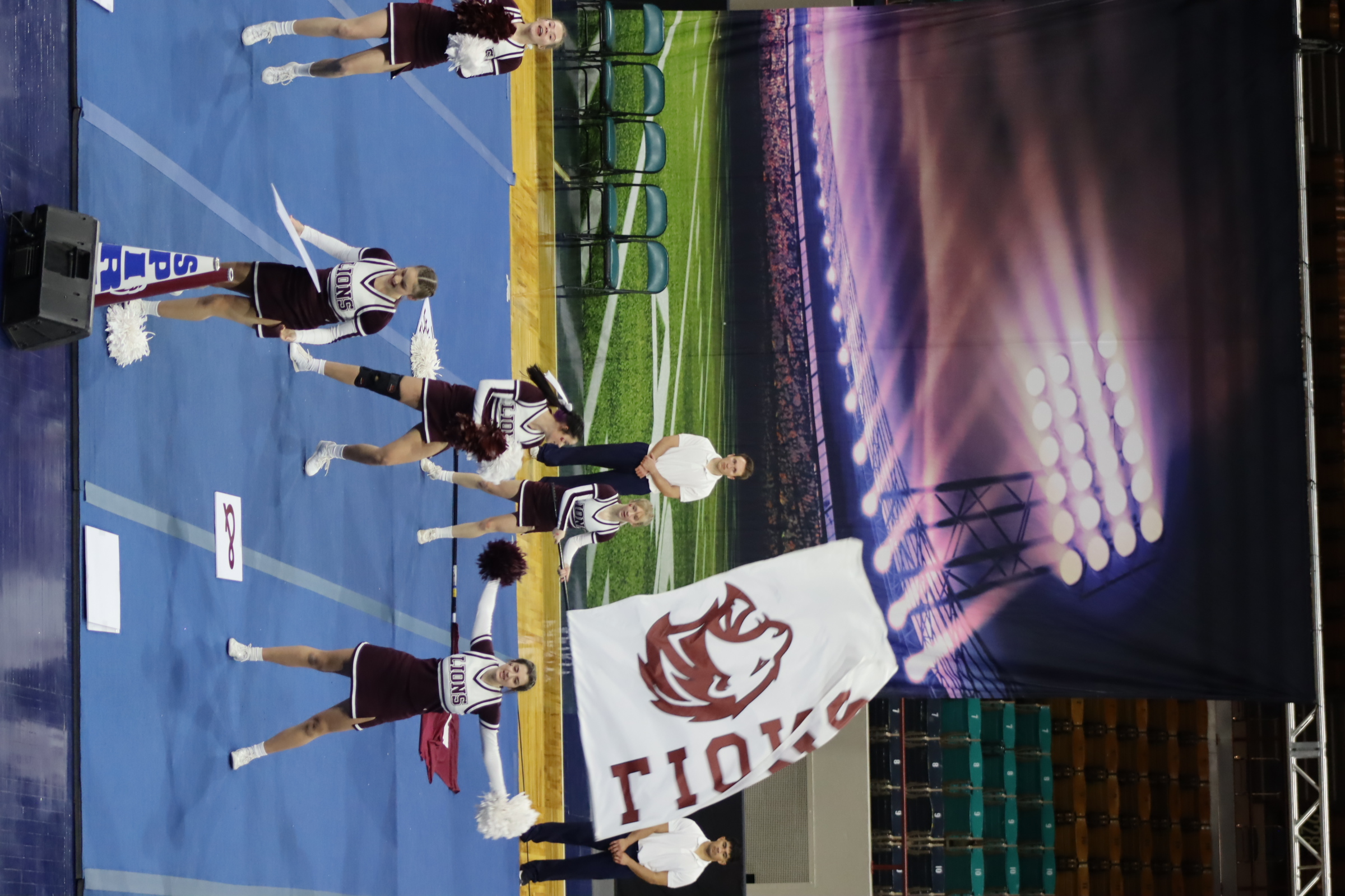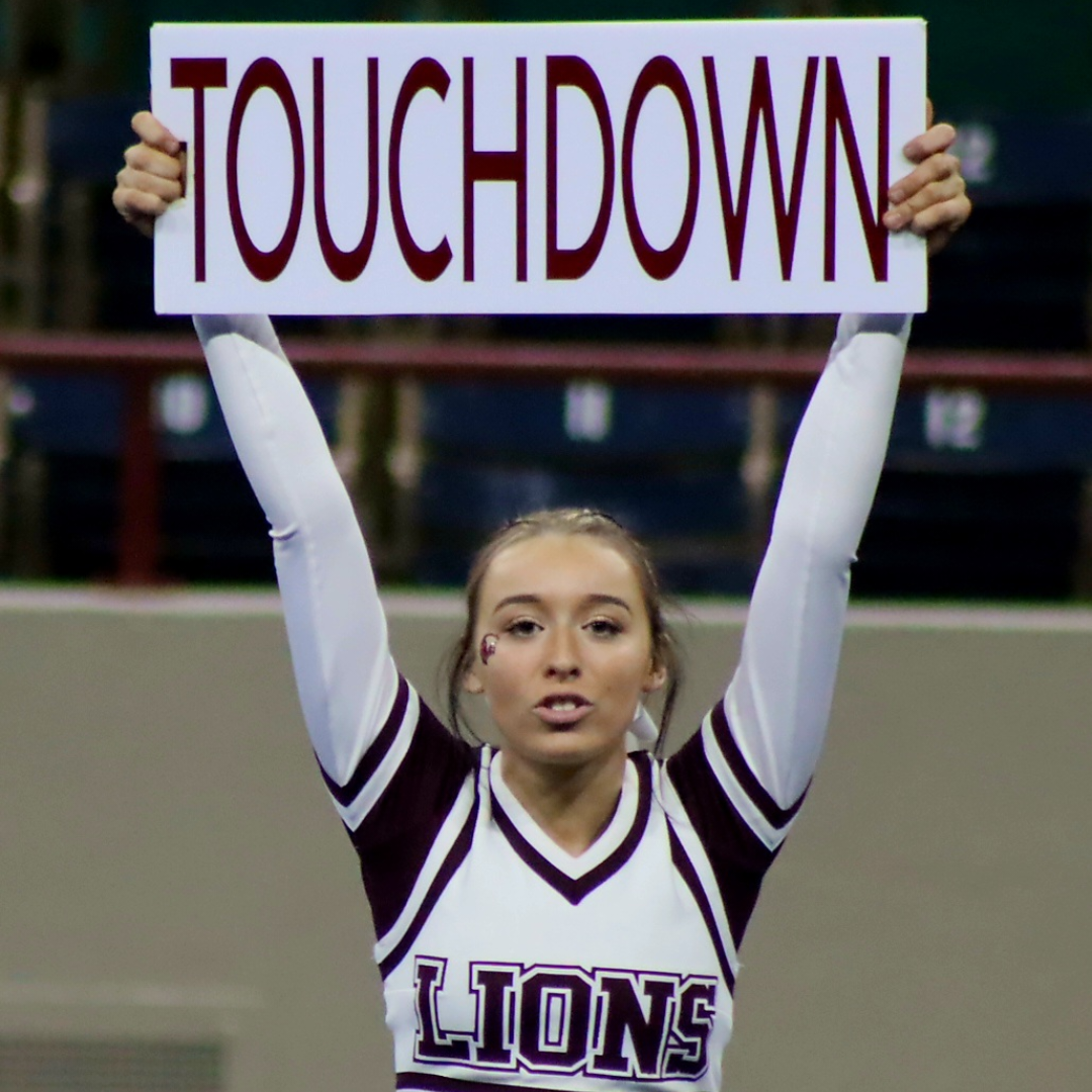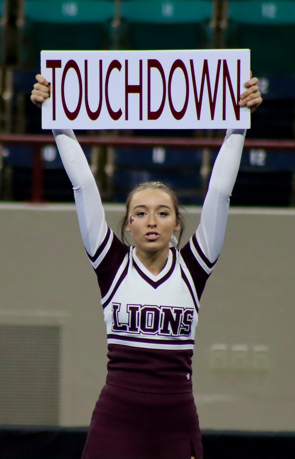 Swink Junior Jade Hunter holds the Touchdown Sign during the Lions preliminary performance at the 2022 State Spirit Competition.