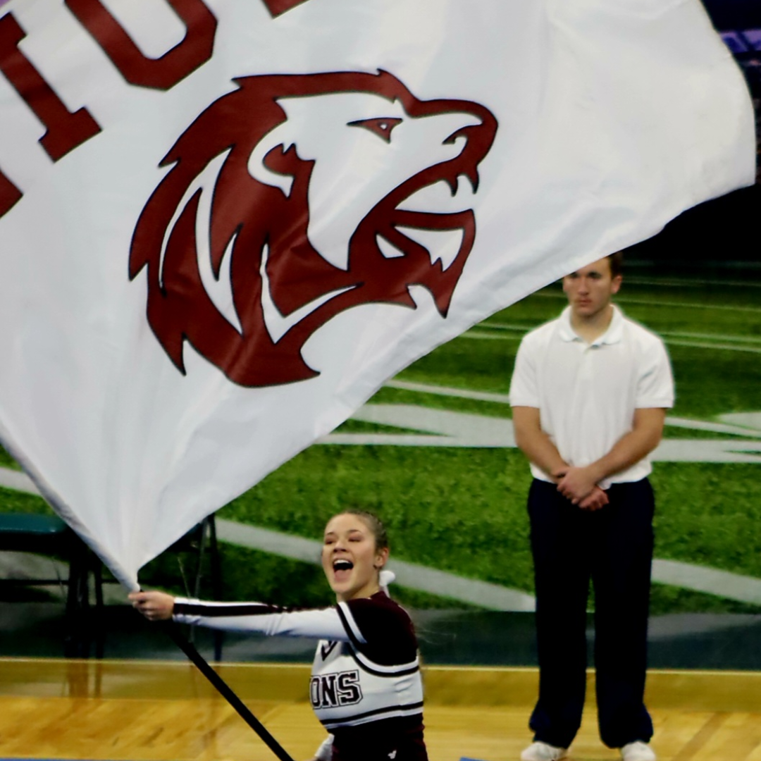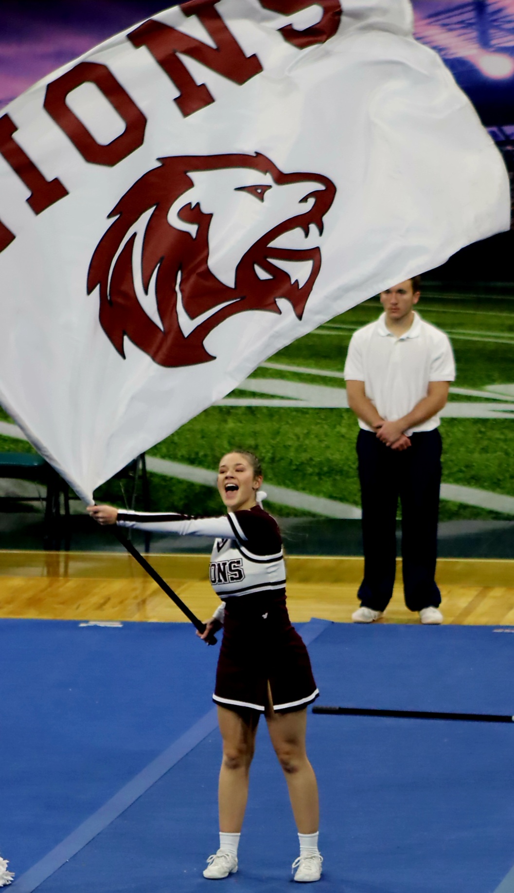 Swink Senior Addison Johnston Waves the Lions Flag in Part during the squads Game Day Routine.