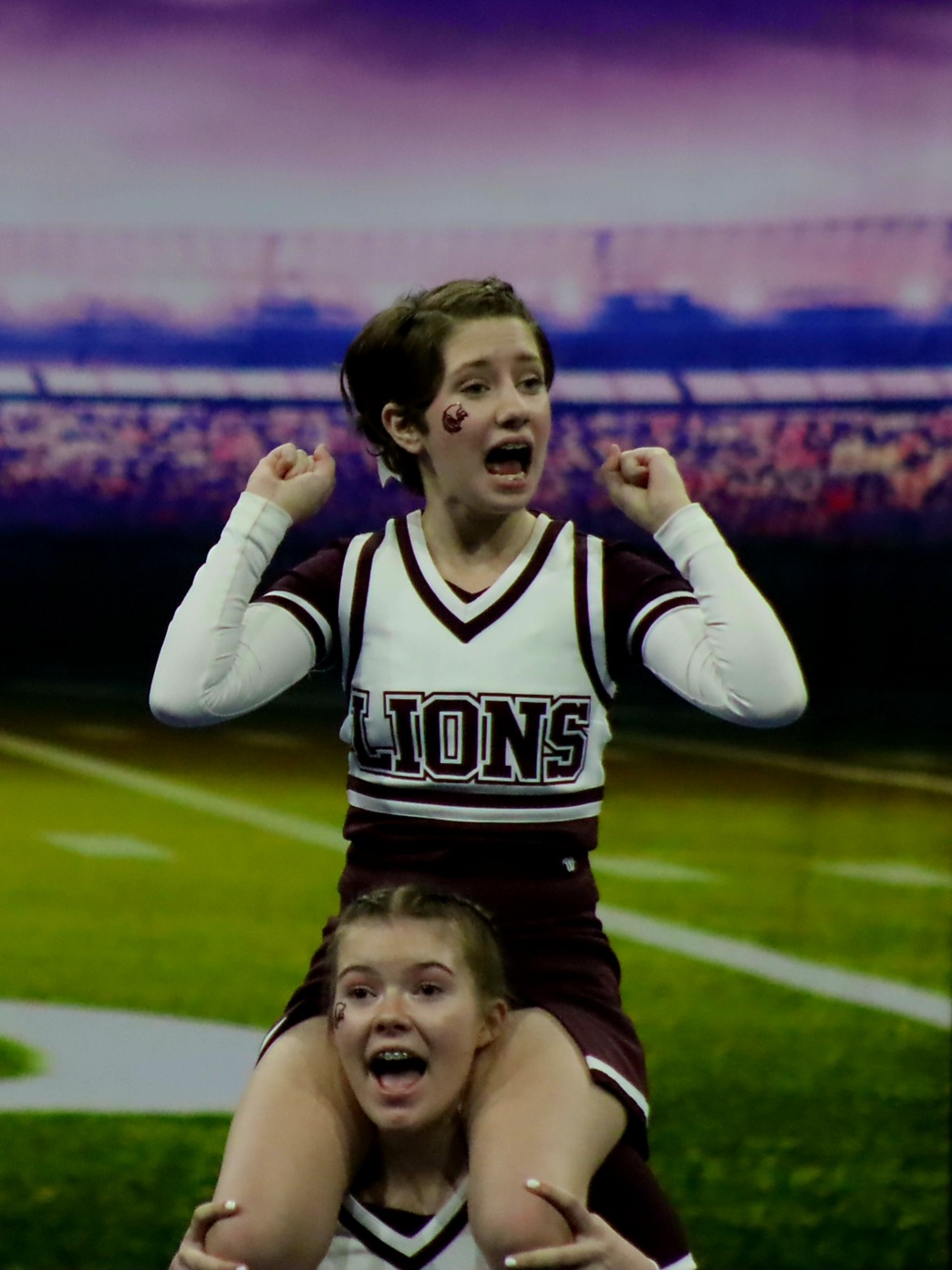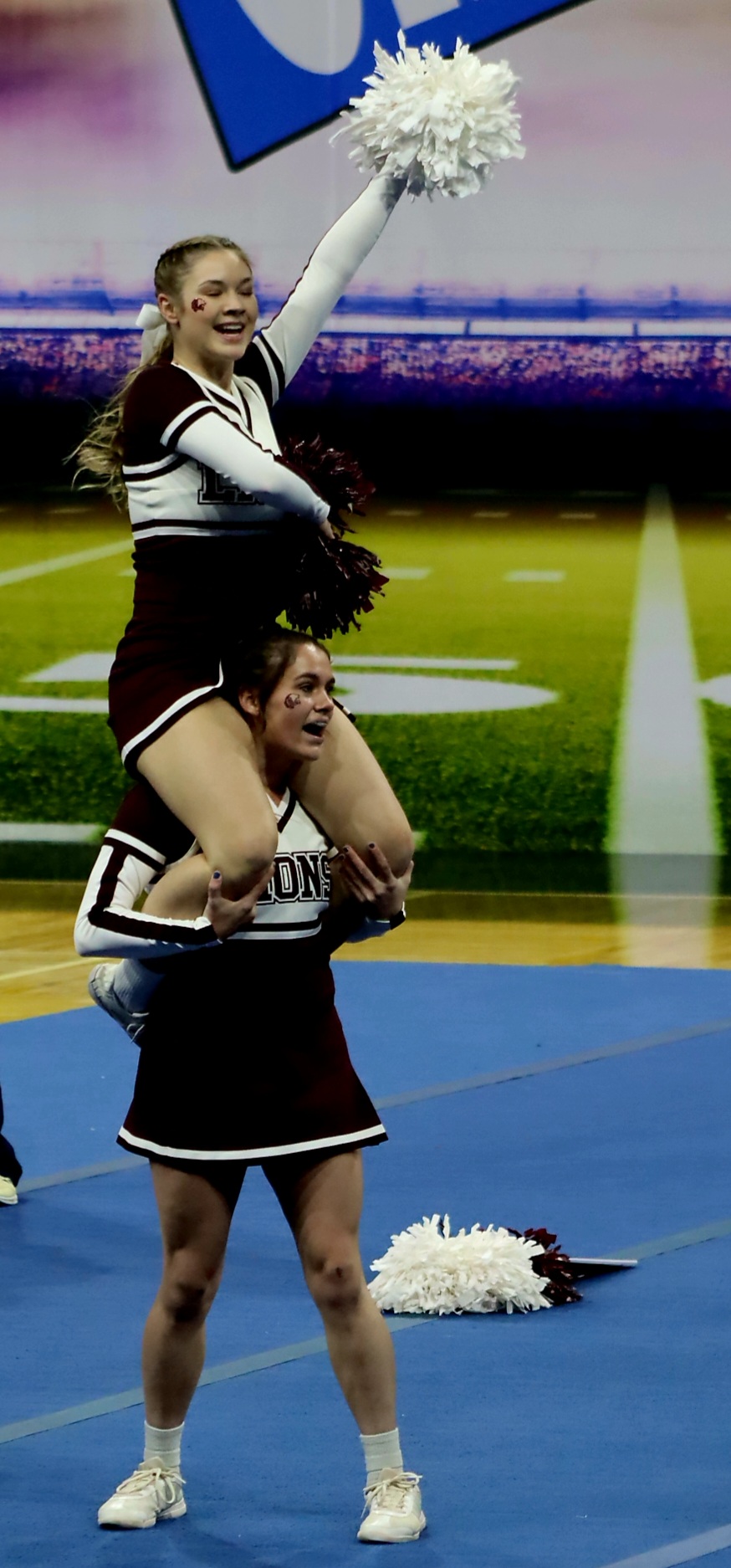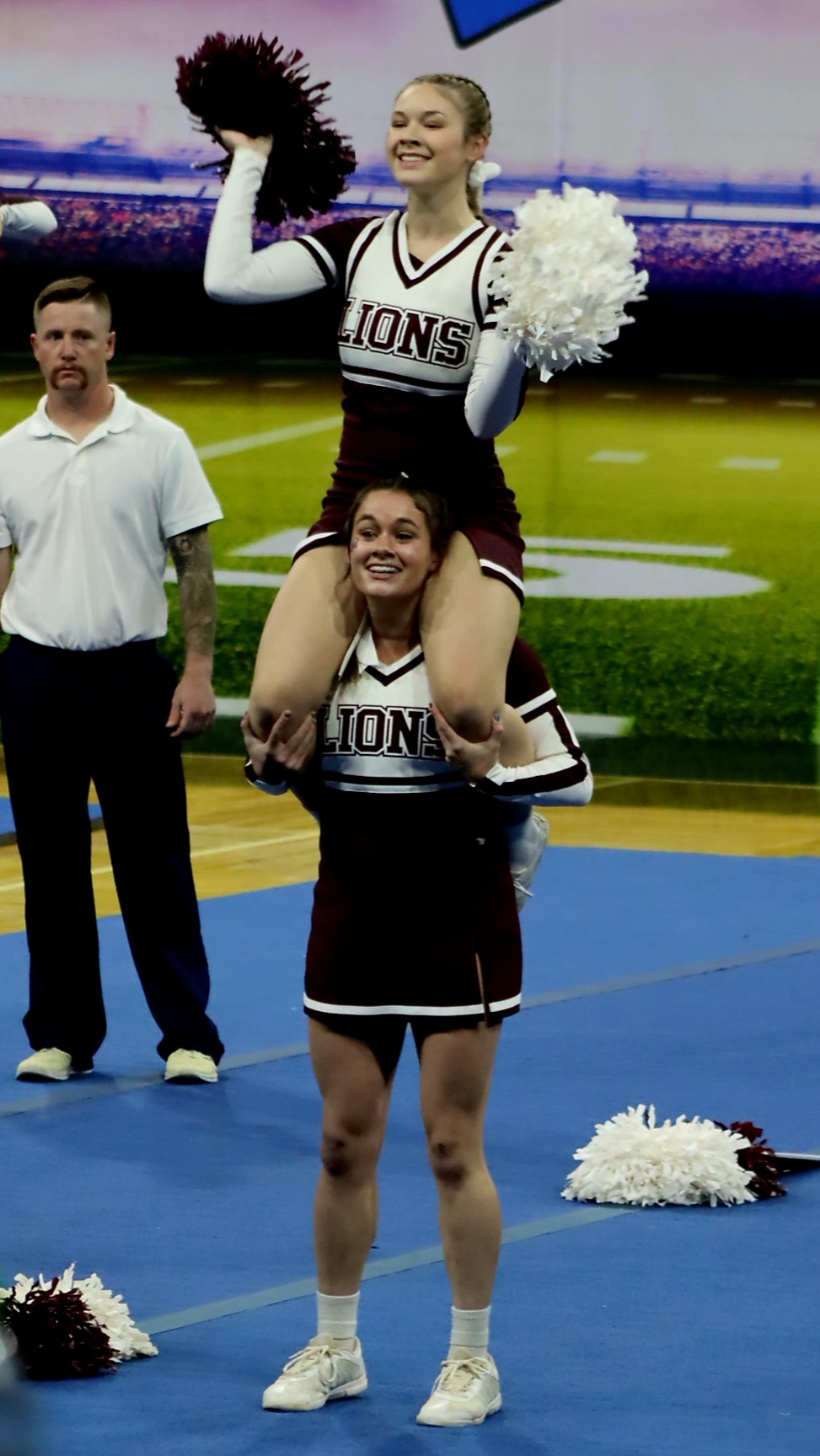 Freshman Madalyn Bamber holds Freshman Audrey Leitner on her shoulders during their preliminary performance.