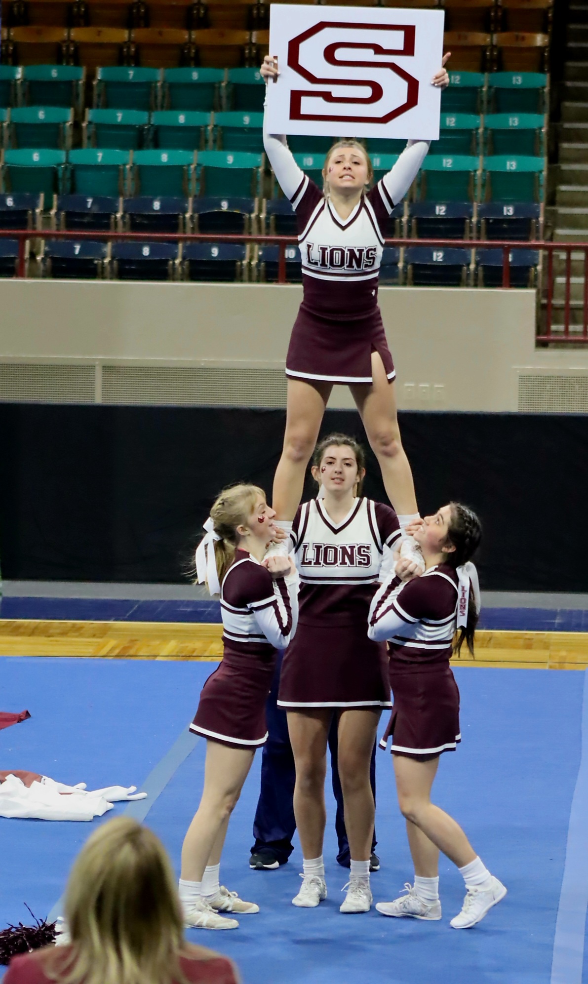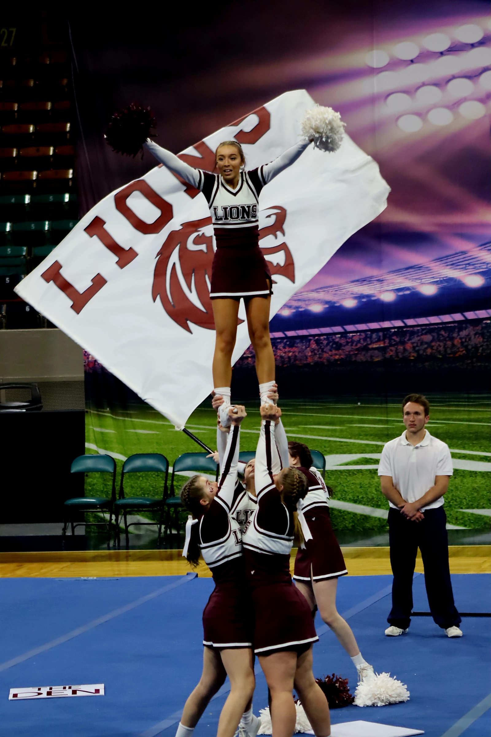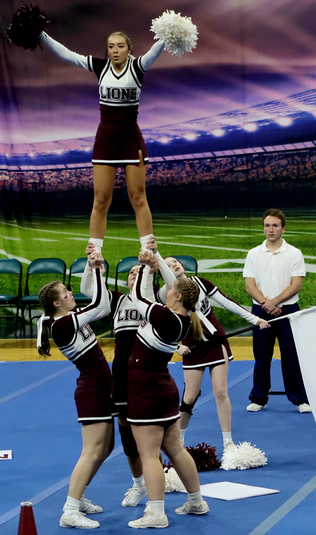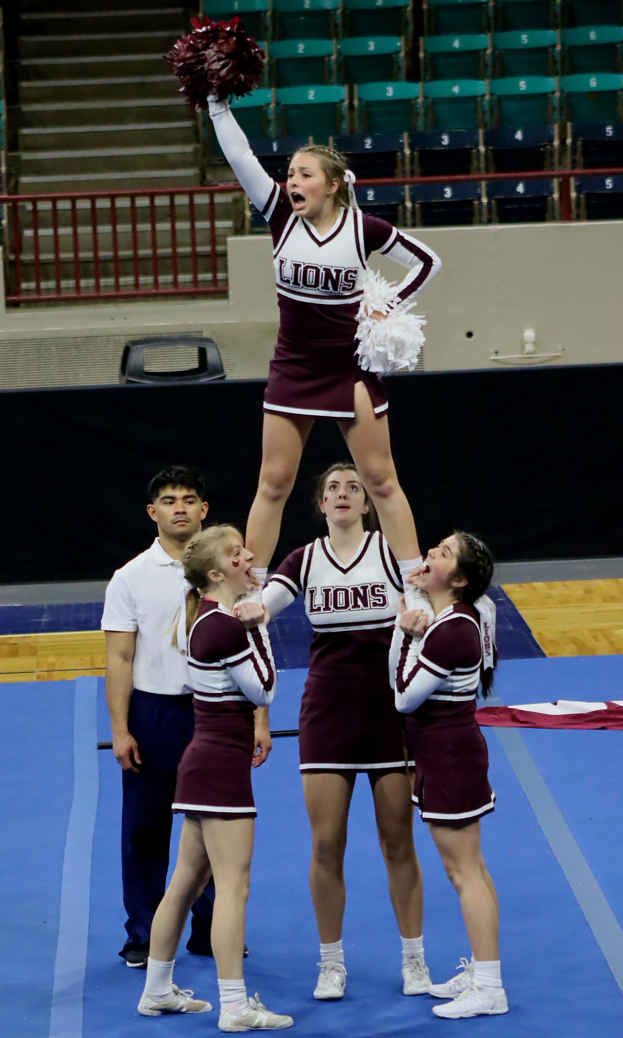 Description: The Swink Lions Cheerleaders Stunting on the Competition Floor at the Denver Coliseum during State Spirit Championships Thursday Afternoon.