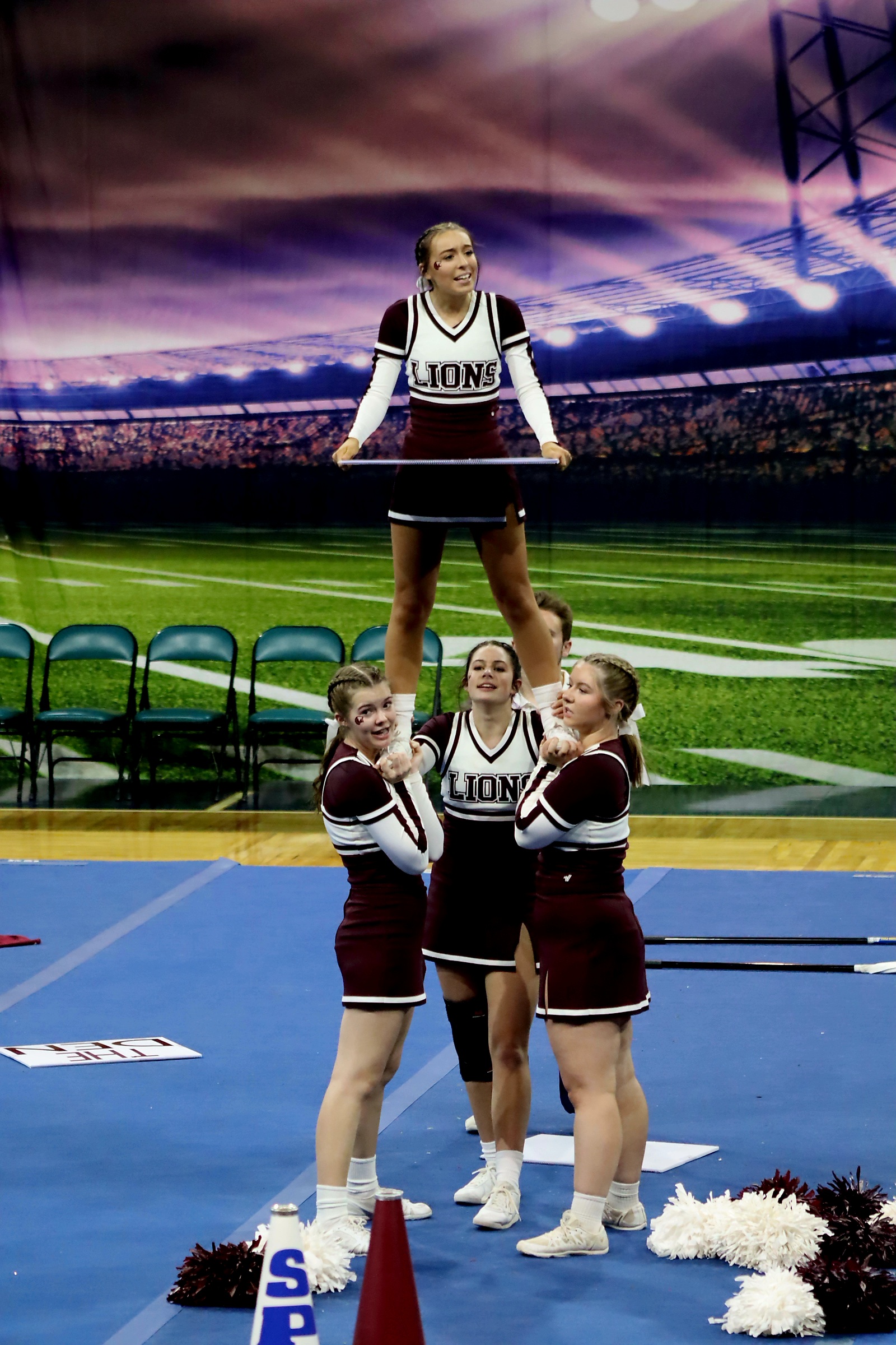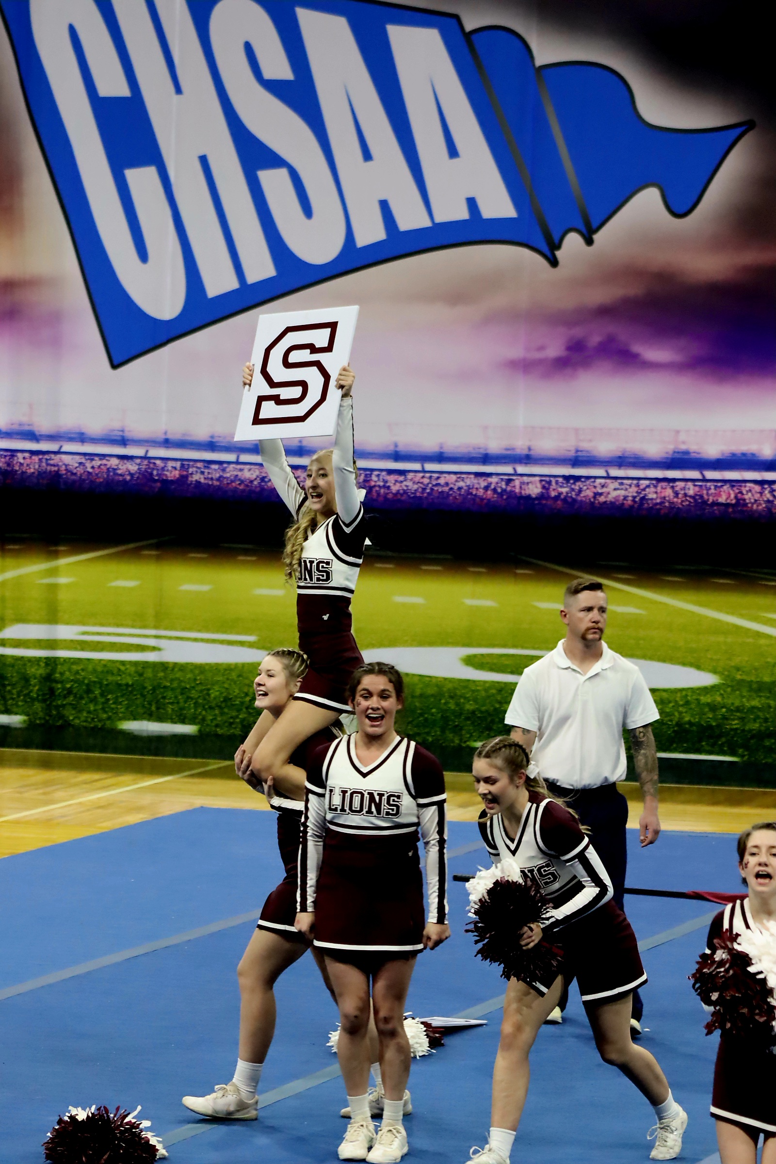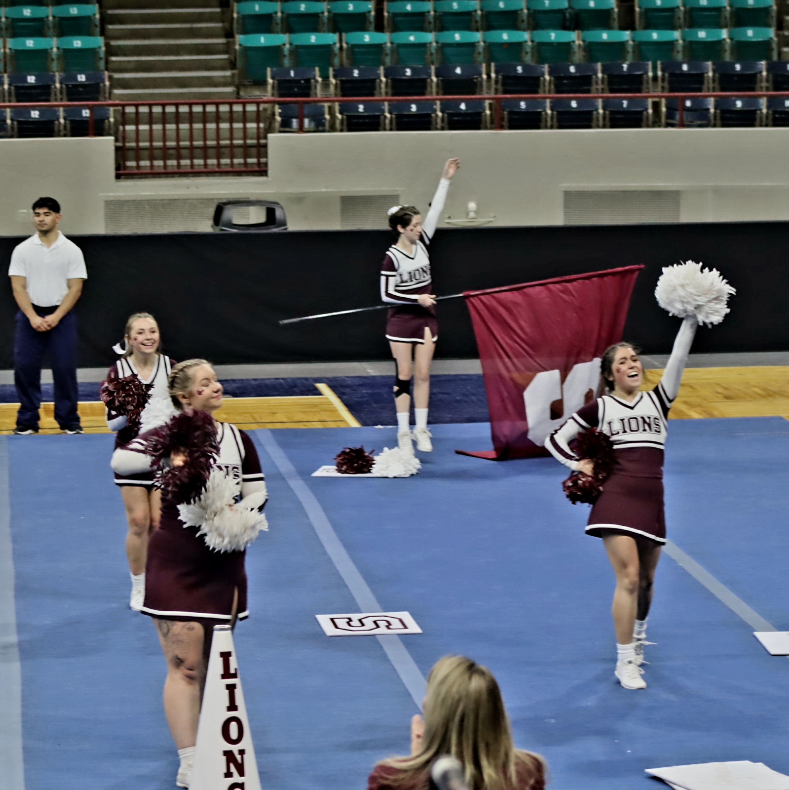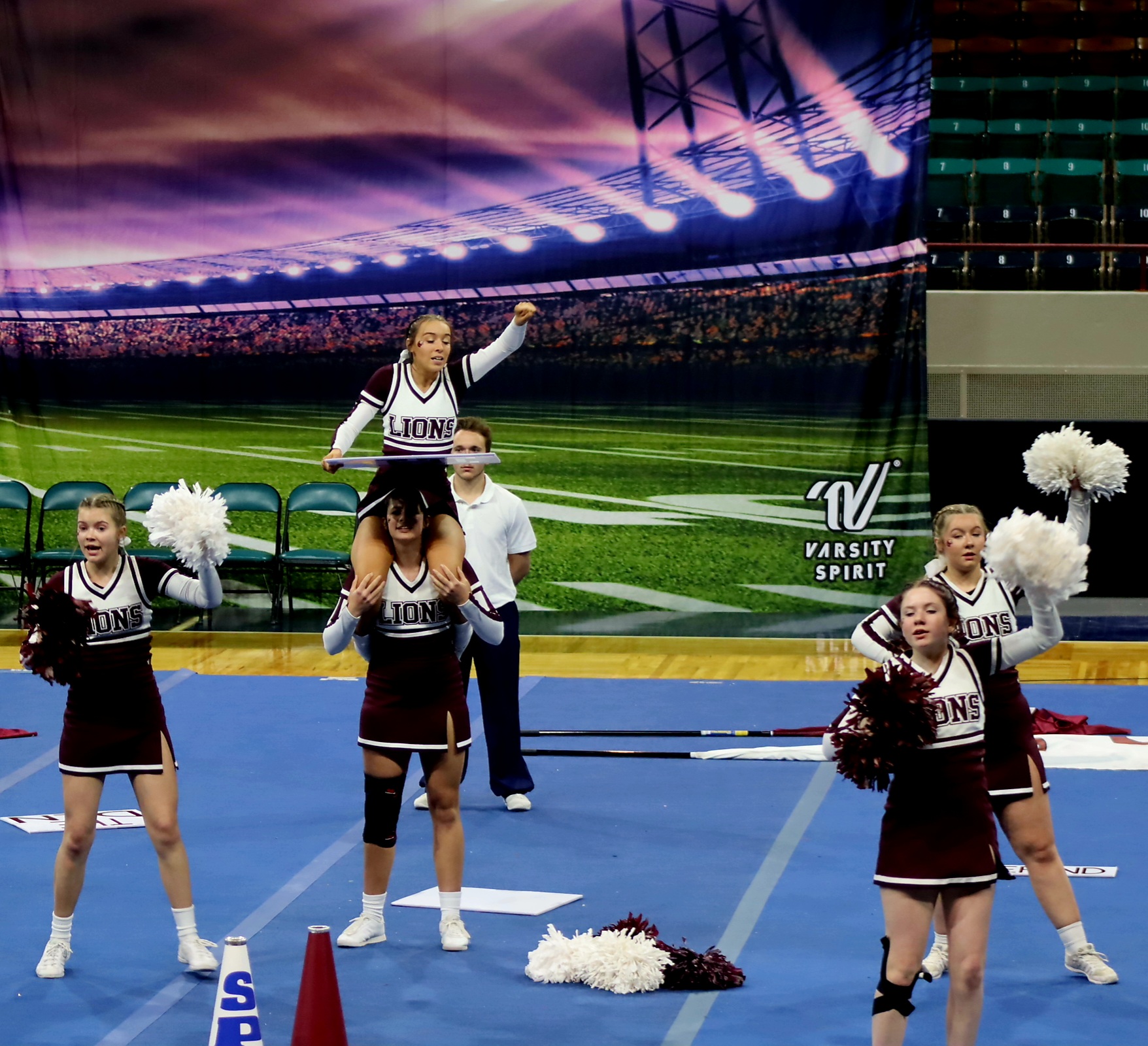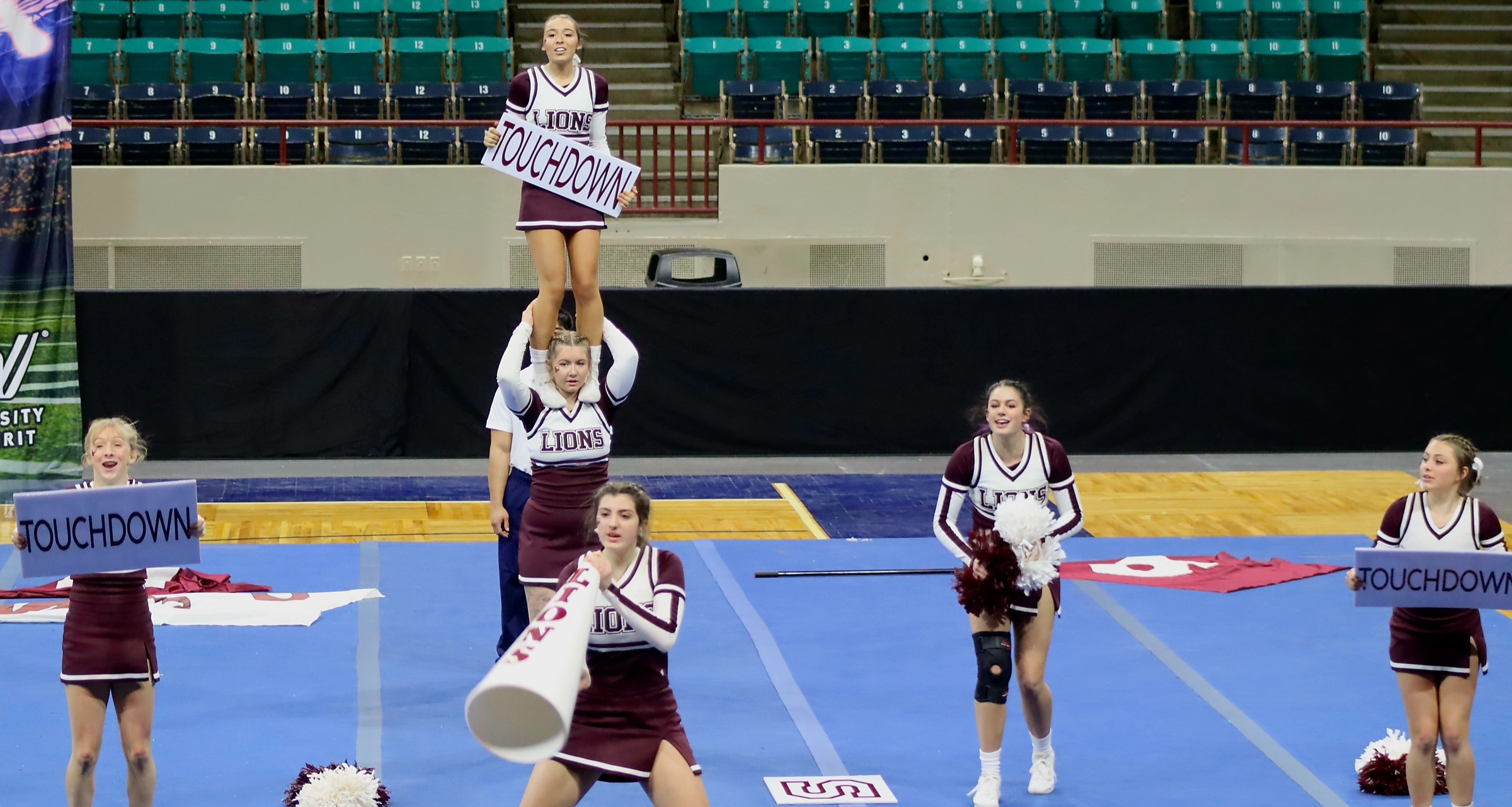Description: The Swink Lions Cheerleaders Placed 4th in the Game Day Division at The CHSAA 2A-3A State Spirit Championships at the Denver Coliseum on December 8, 2022.