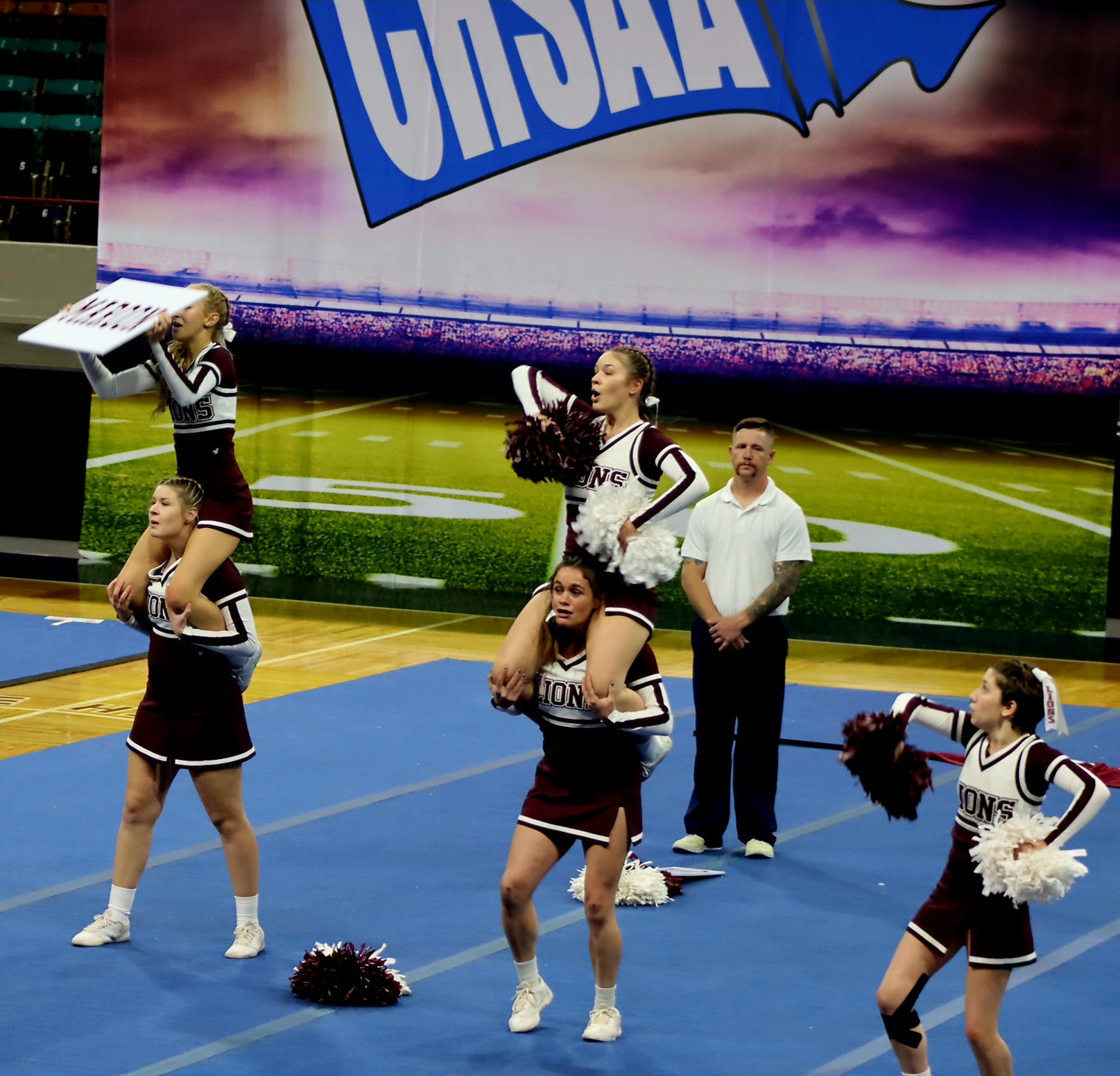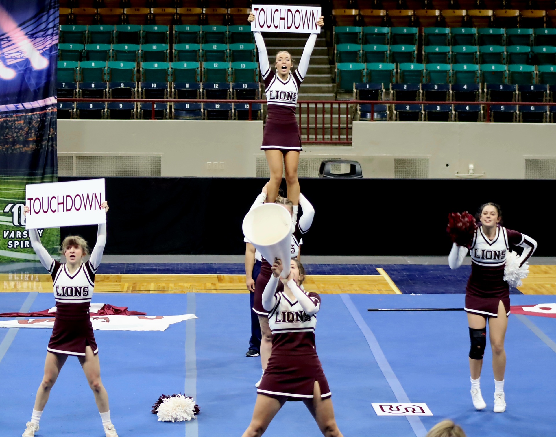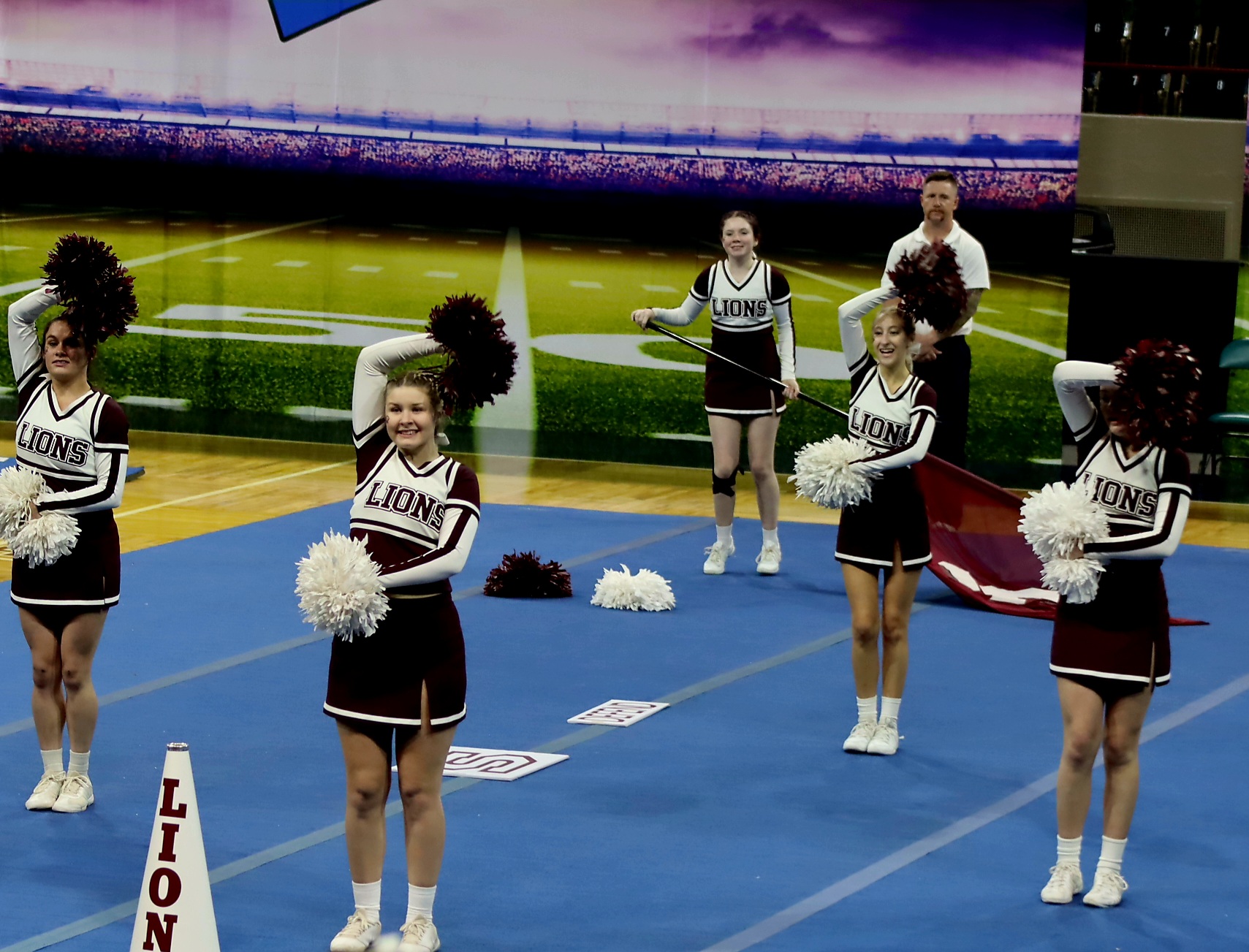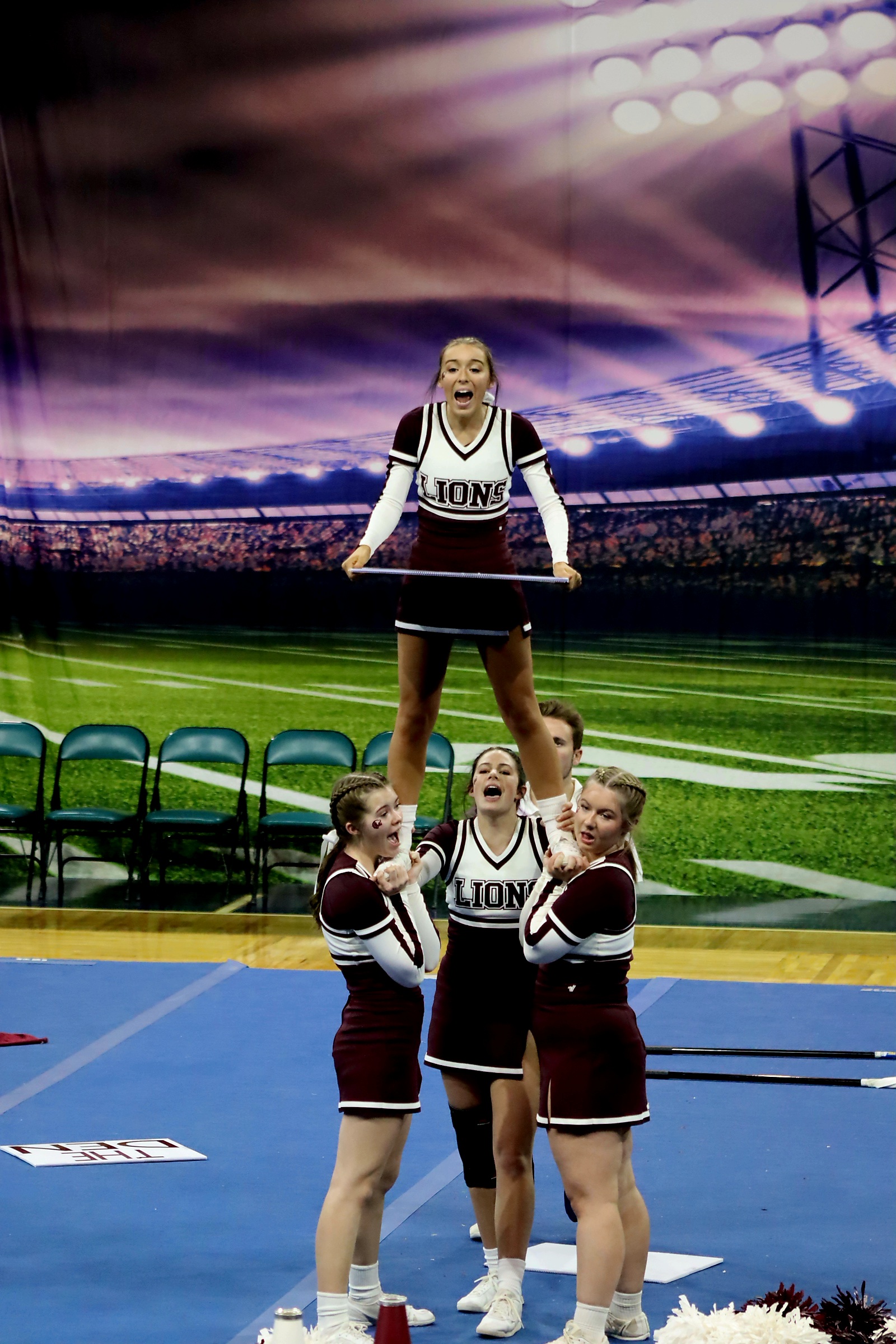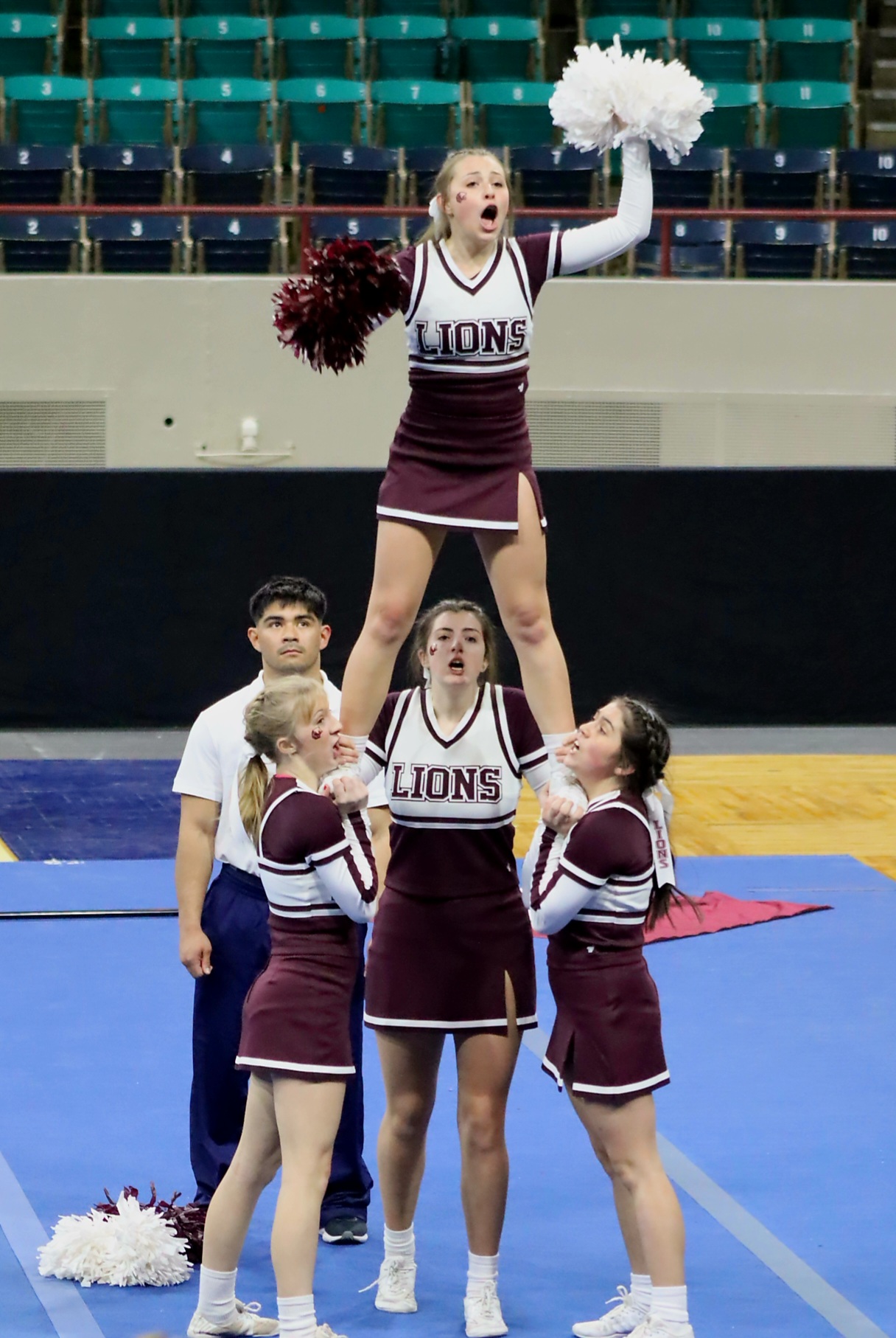 Description: The Swink Lions Cheerleaders Placed 4th in the Game Day Division at The CHSAA 2A-3A State Spirit Championships at the Denver Coliseum on December 8, 2022.