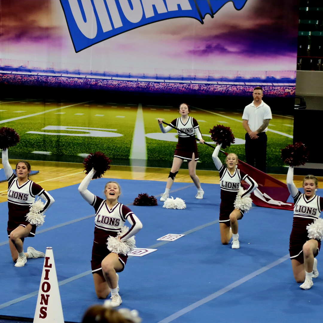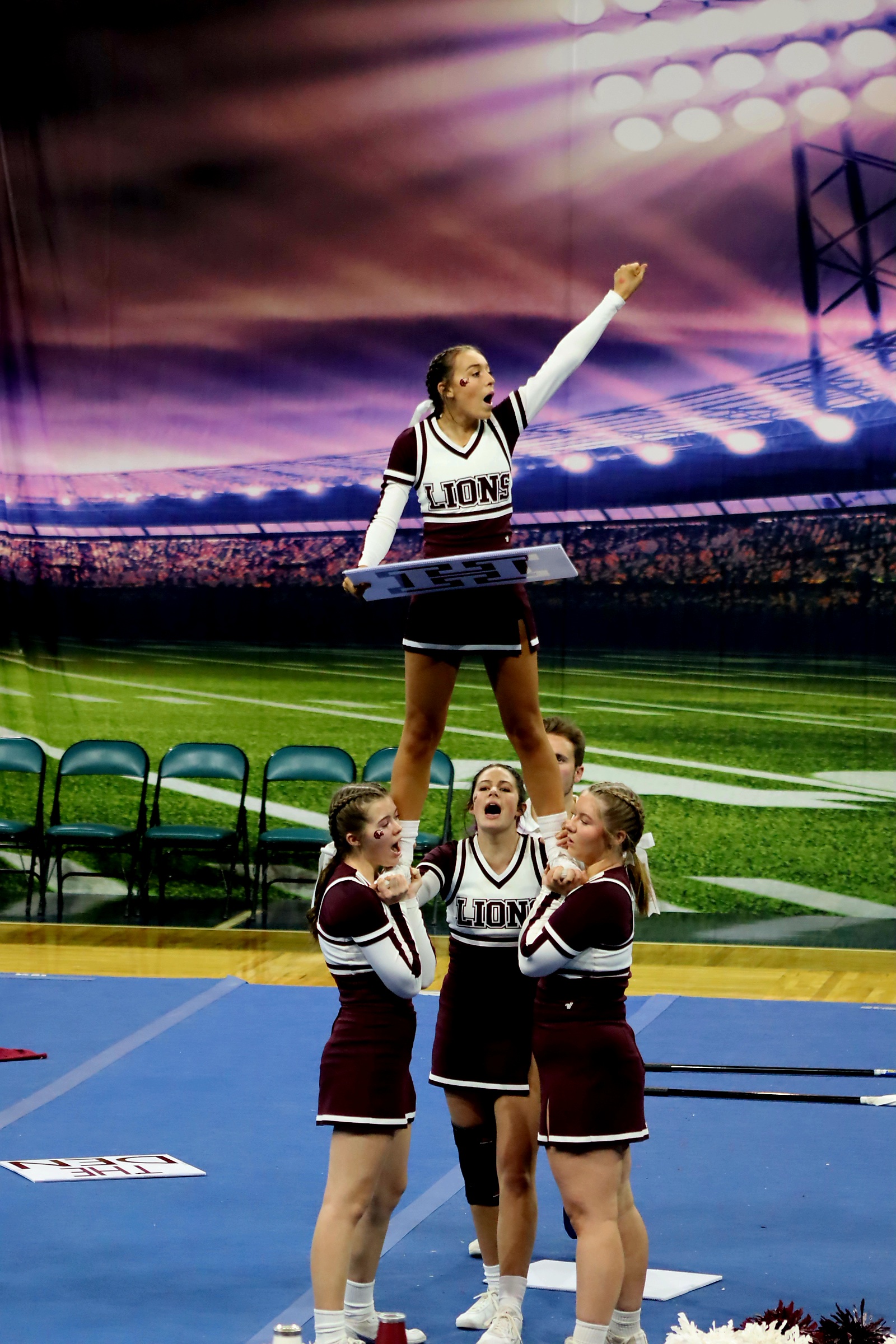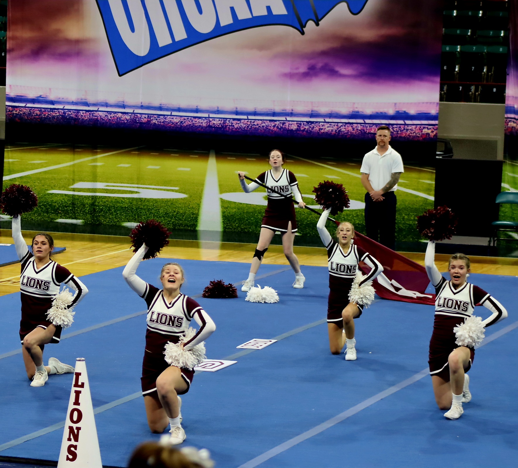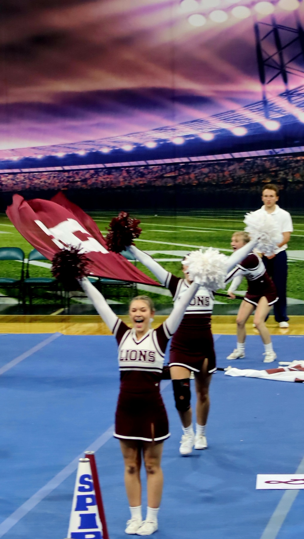 Description: The Swink Lions Cheerleaders Placed 4th in the Game Day Division at The CHSAA 2A-3A State Spirit Championships at the Denver Coliseum on December 8, 2022.