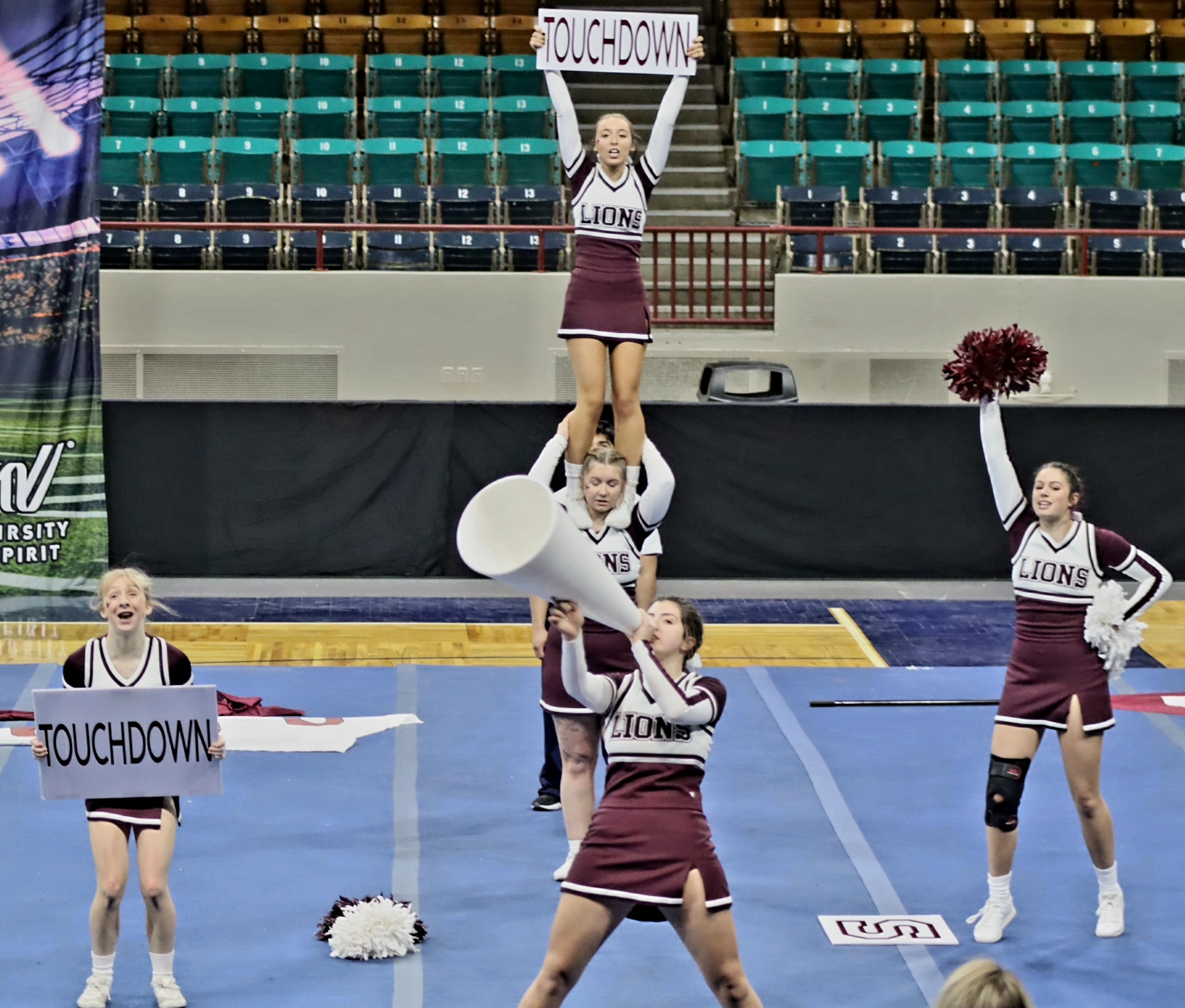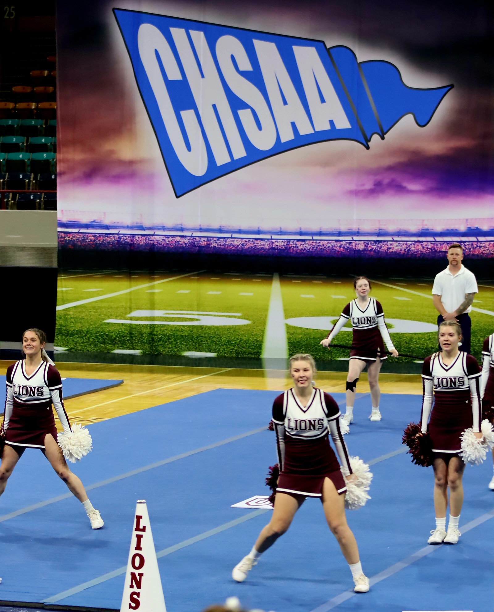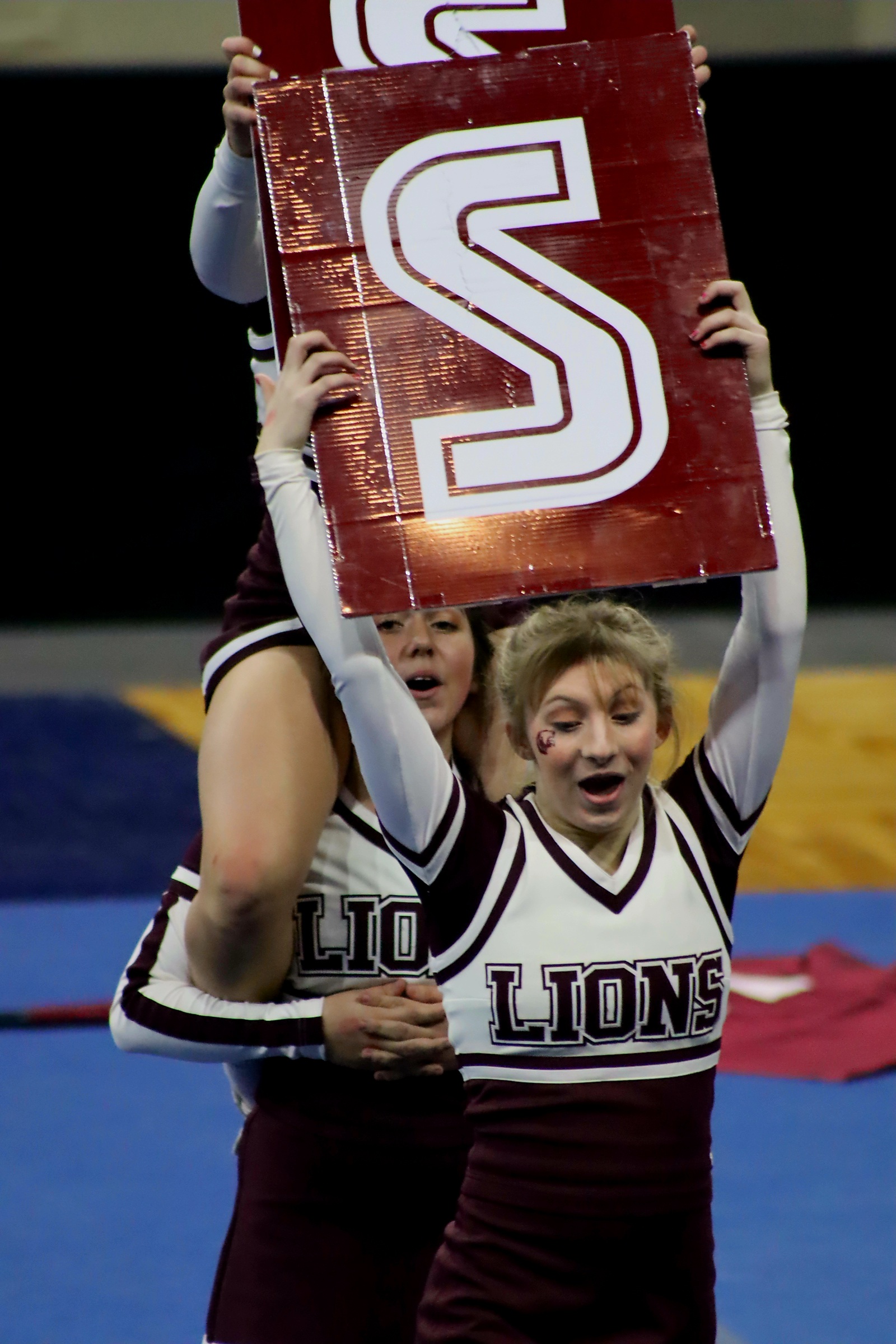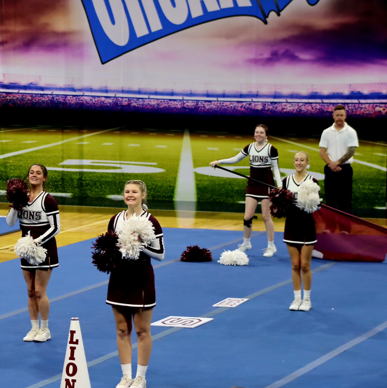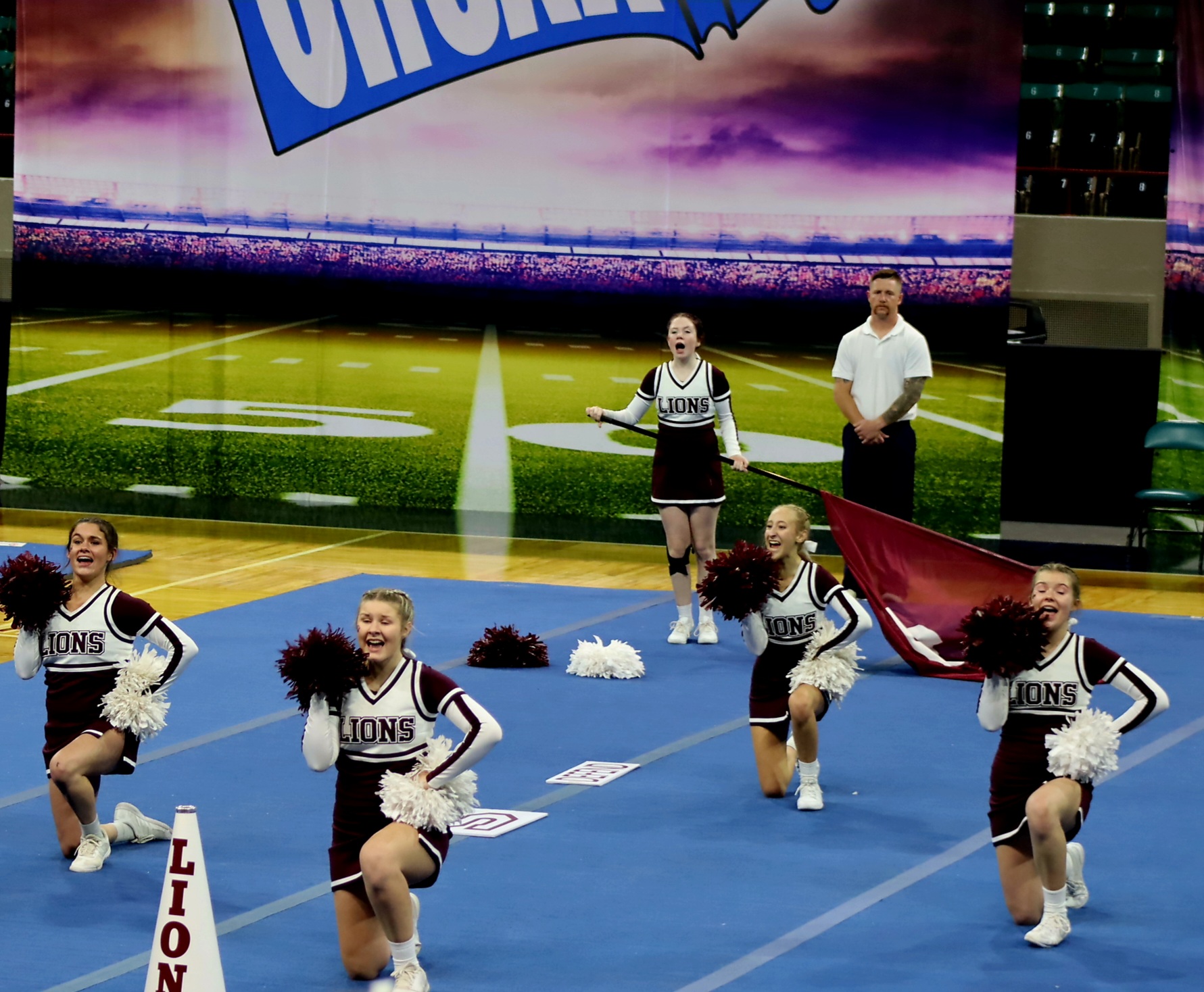 Description: The Swink Lions Cheerleaders Placed 4th in the Game Day Division at The CHSAA 2A-3A State Spirit Championships at the Denver Coliseum on December 8, 2022.